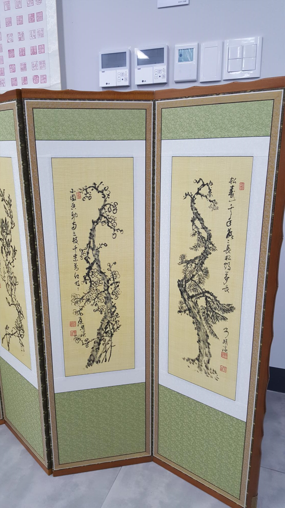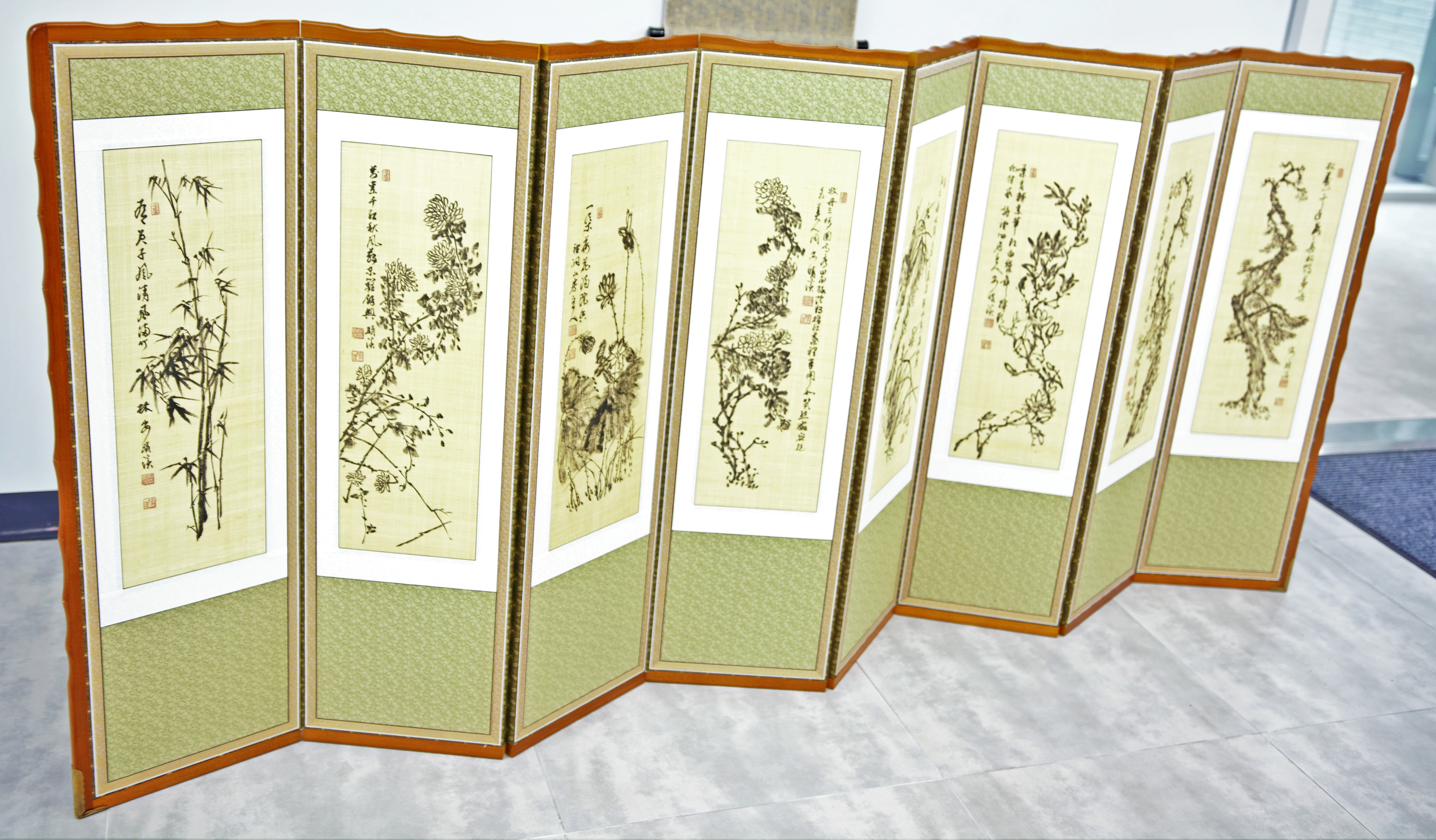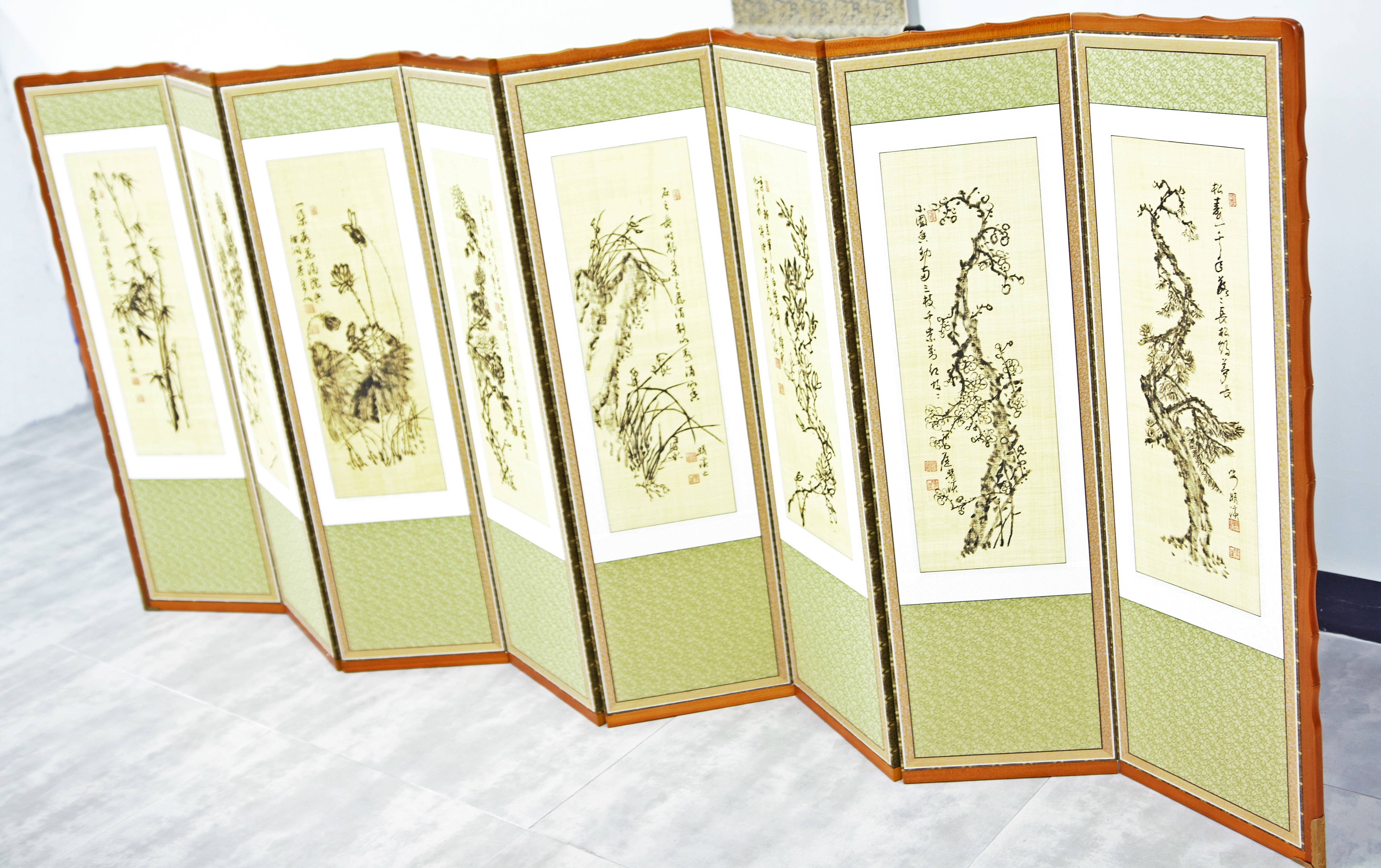 삼베소재에 사군자 등 8폭(소나무, 매화, 목련, 난초, 목단, 연, 국화, 대나무)을 그린 특별한 8폭병풍 작품이다.