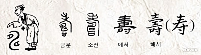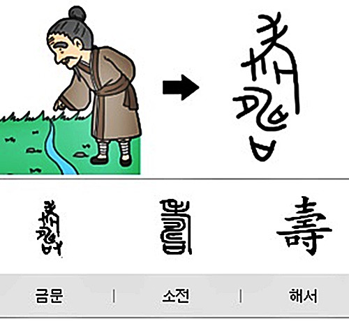 ‘壽’의 갑골문 자형을 보면, 윗부분은 허리가 굽은 노인이고 아랫부분은 한 손과 ‘口’ 하나가 있다. 전체 한자는 손으로 잔을 들고 노인에게 축수하는 장면을 본뜬 것이다.