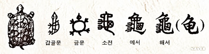 갑골문에 나온 龜(구)자를 보면 거북이를 측면이나 이미지 정면으로 이미지 그린 형태가 있었는데, 지금의 龜(구)자는 측면으로 그려진 것이 변형된 것이다.