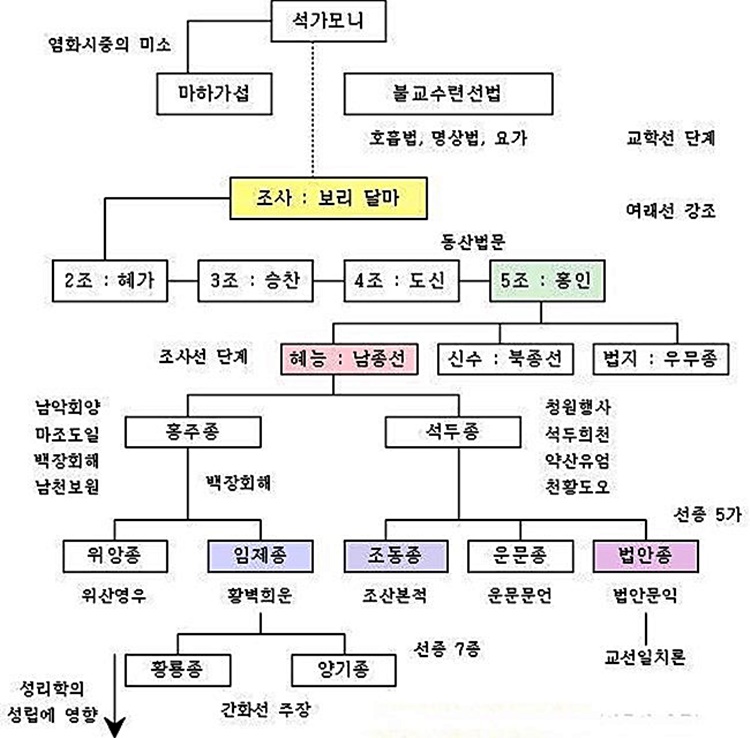 이렇게 부처님으로 부터 33조사에 이르고 선5종으로 생겨진 법맥이 우리나라는 임제종의 혈맥으로 수년전에 해인사에서 입적하신 성철스님과 백양사에서 좌탈입망을 보이시고 오방수로서 사리를 습득하여 세상을 놀라게하신 서옹선사 등이 부처님으로 부터 70대 조사에 이르고 있는 것입니다.