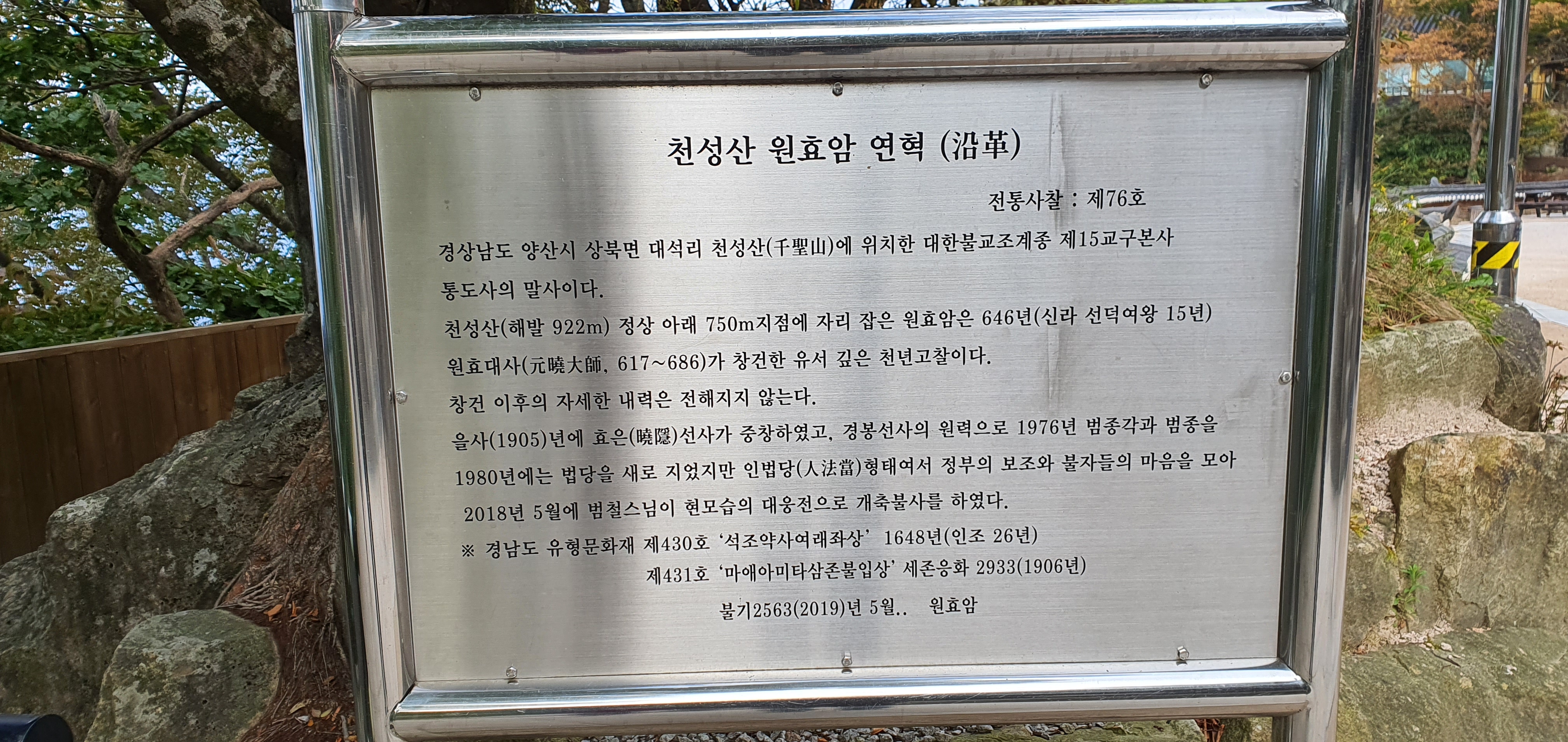 646년(선덕여왕 15)에 원효(元曉)가 창건하였으며, 1905년에 효은(曉隱)이 중창하였다고 한다.