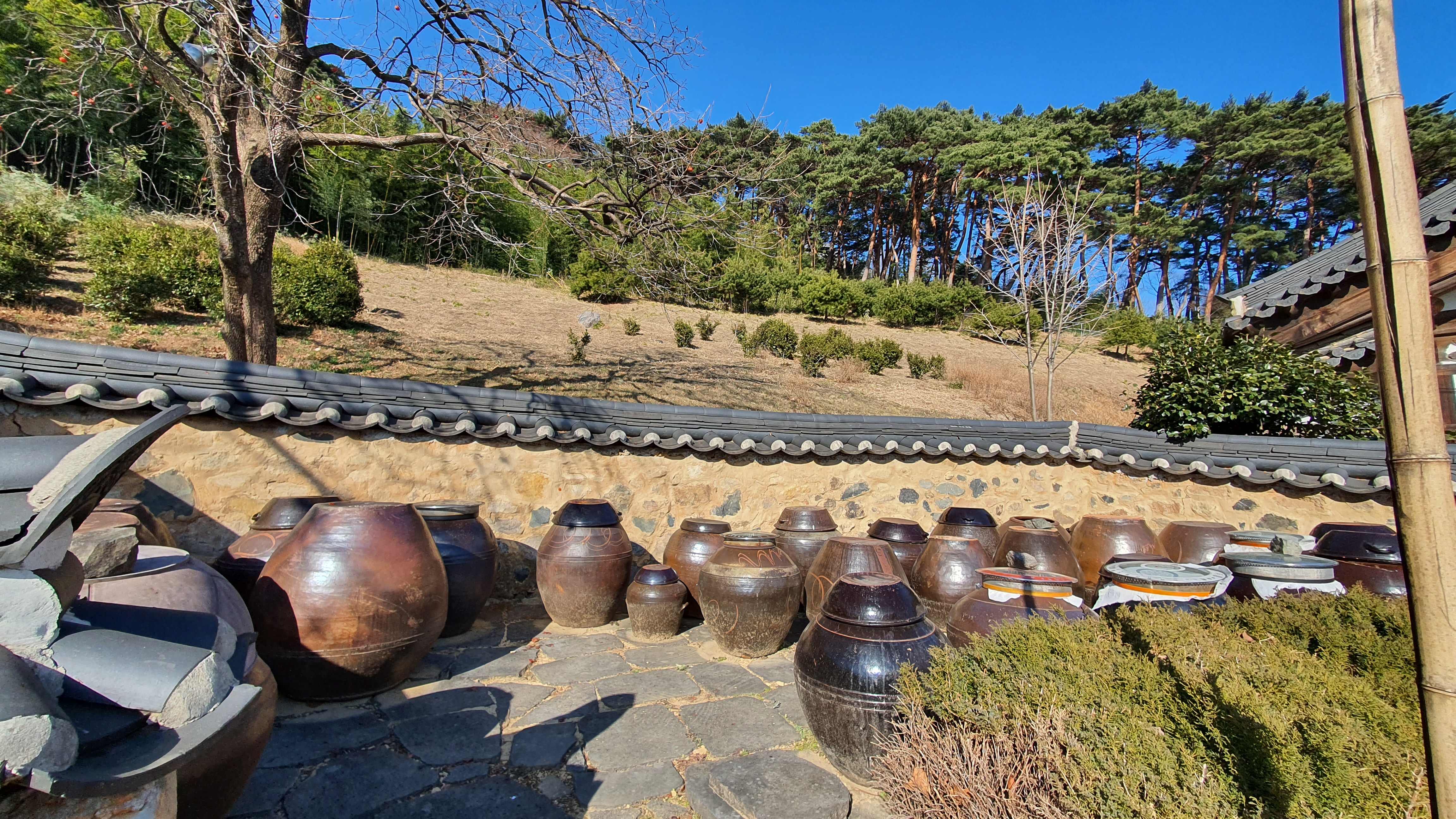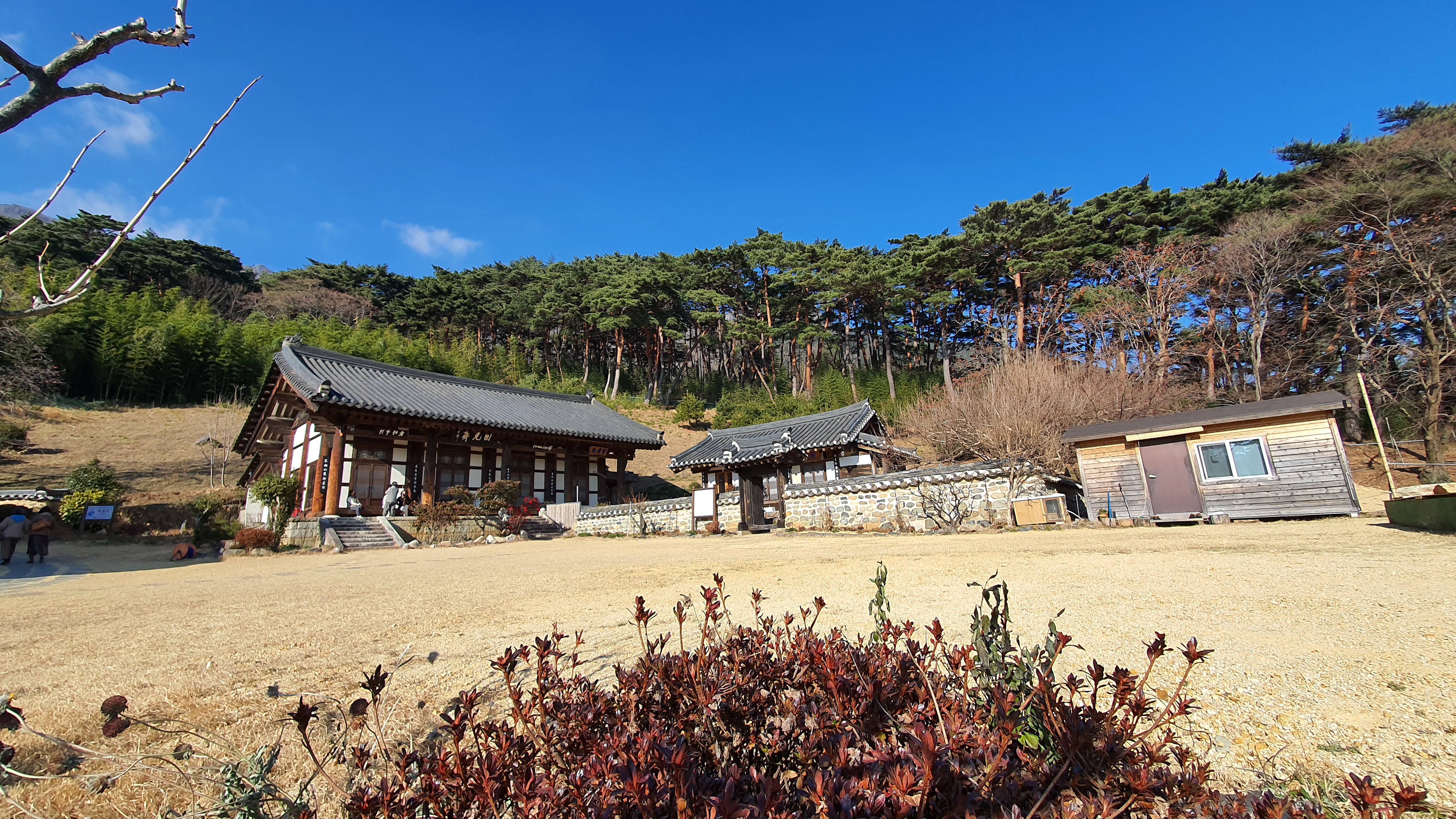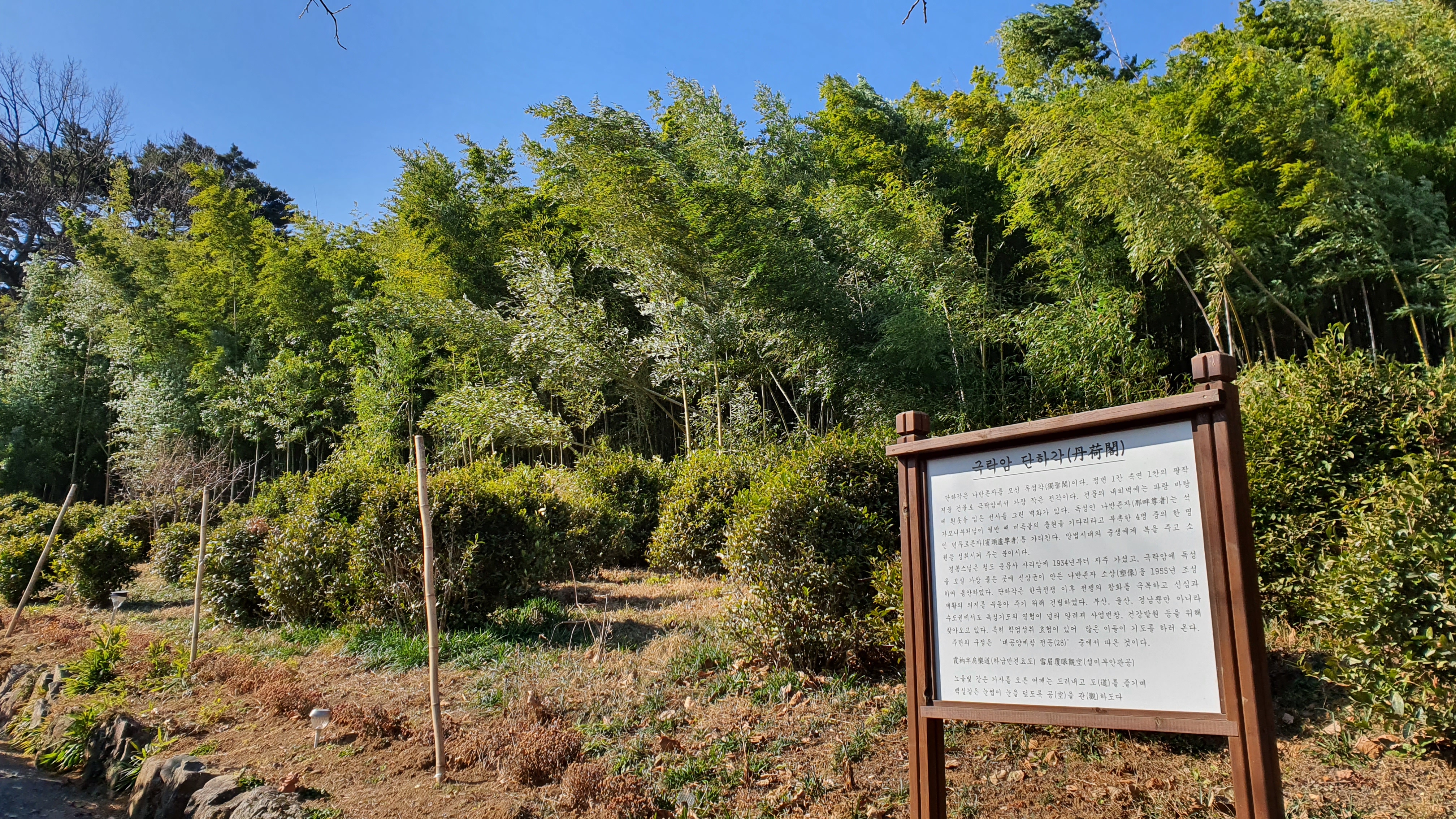 법당 뒤로 가는 길은 동백나무와 대나무가 어우러진 길이다. 그전에 “사람과 만물을 살려주는 것은 물이다. … 사람도 물과 같이 우주 만물에 이익을 주어야 한다.”라는 법문이 새겨진 <산정약수> 비문을 읽어야 한다.