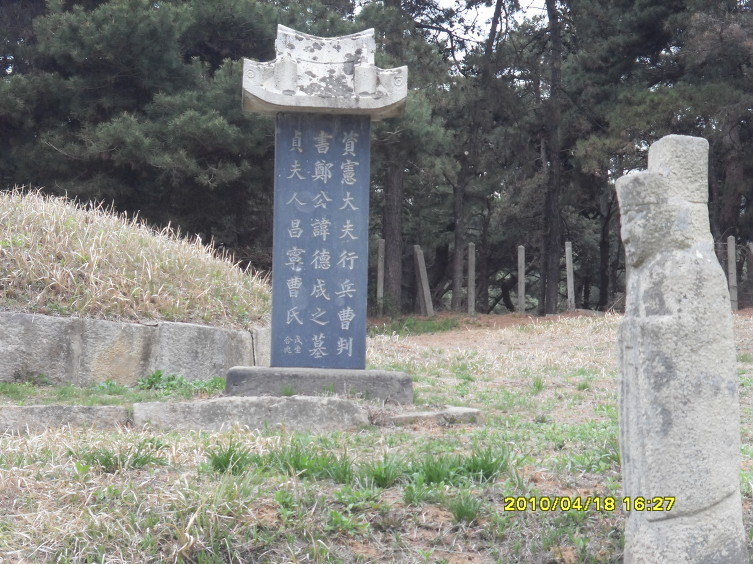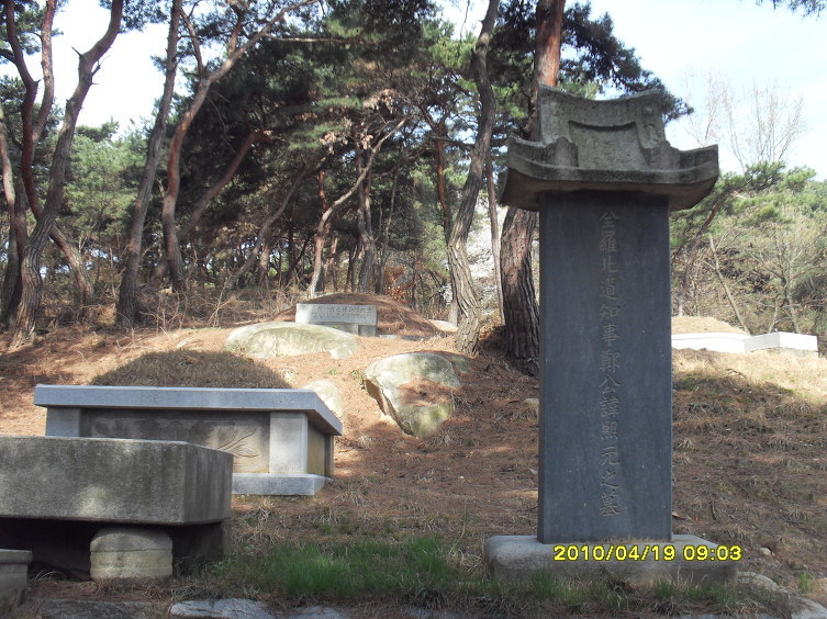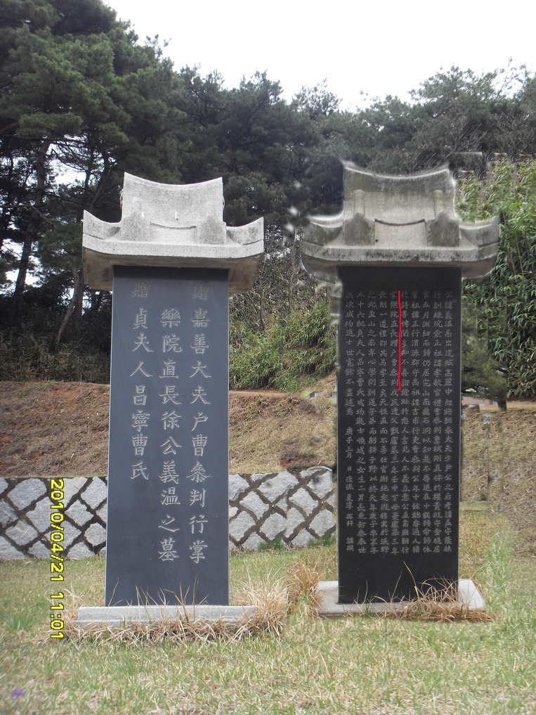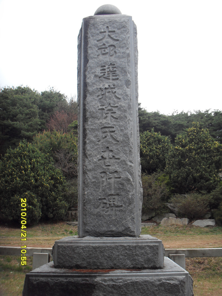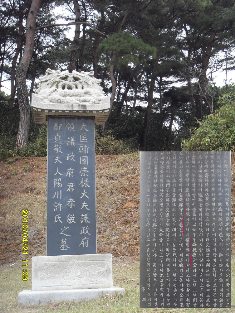 정2품(하) 자헌대부의 비(세종조에 육진 개척의 공으로 사작(賜爵)받음. 諱(꺼릴 휘:돌아가신 분에게만 쓰며 살아게신 분은 銜(함)자를 쓴다.)자는 대개 벼슬이 높은 사람, 시조 등에 쓴다.