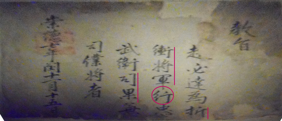 이 교지는 정3품 상 절충장군(무관) 품계와 충무위 사과(정6품) 직을 내리는 것으로 품계는 높고 직위가 낮기 때문에 품계와 직 사이에 行을 썼다. 이와 같이 교지나 문서에는 行守法에 맞게 품계와 직위를 썼다. 비석에도 마찬가지다.