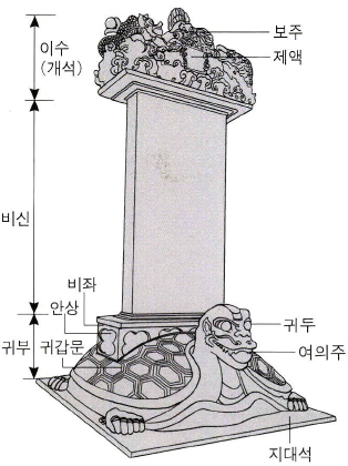 | 신도비 (神道碑) | 종2품 이상 벼슬아치의 무덤 앞이나 무덤으로 가는 길목에 세워놓는데 죽은이의 생애에 관한 사항들을 새긴 비. 밑부분은 거북받침을 하여 그 위에 직사각형의 비석을 세우고 다시 그 위에 비갓을 올려 놓았으며 무덤 남동쪽 지점에 남쪽을 향하여 세운다. |