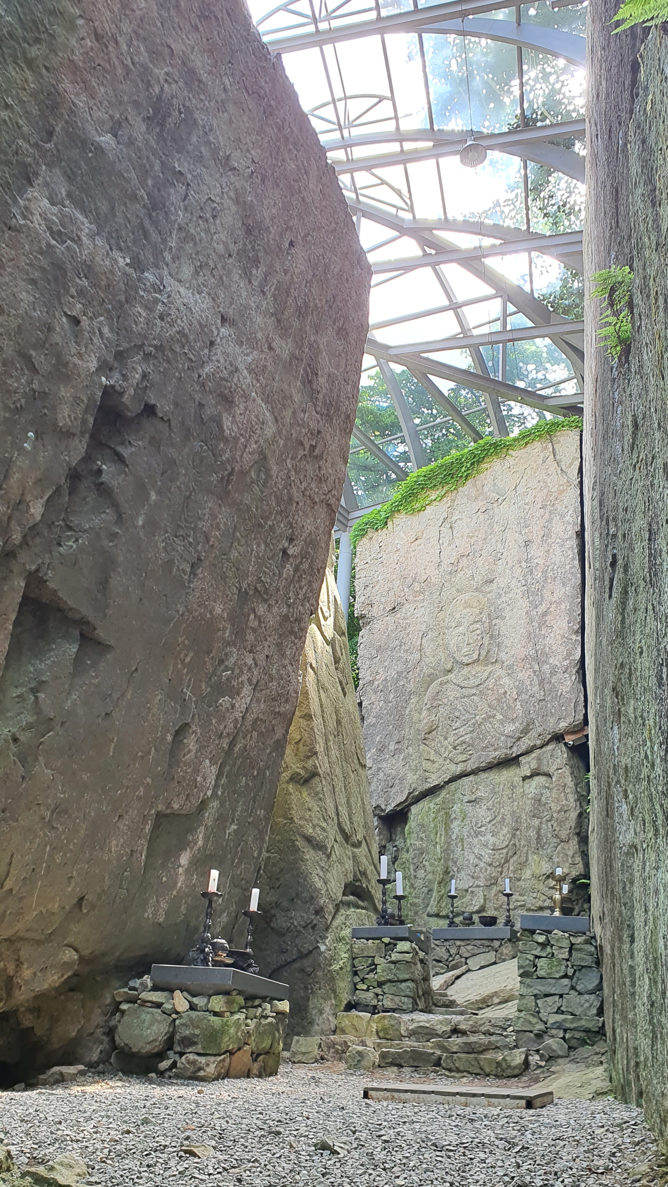 이들과 마주보는 남면 바위에는 "경주상인암조상명기(慶州上人庵造像銘記)"로 시작되는 긴 명문(銘文)이 음각되었고 마멸이 심하긴 하나 보살입상 1구도 함께 새겨져 있다. 동쪽 면에도 나형(裸形)의 상체에 왼손을 들어 가슴에 대고 오른손에 보병을 쥔 보살입상이 있다. 이들과는 따로 떨어져 동북쪽 바위 모퉁이에는 독립된 바위면에 높이 8.2m의 고부조(高浮彫)로 된 거대한 여래입상이 있는데 앞서의 명문귀절로 미루어 위 보살상들과 함께 삼존형식을 취하고 있는 본존상임을 알 수 있다. 이 자연석실은 초기 석굴사원의 시원양식을 보여주는 중요한 예로 당시 신앙형태, 특히 화랑도와 미륵신앙과의 관계를 밝히는 데도 중요한 자료이다.