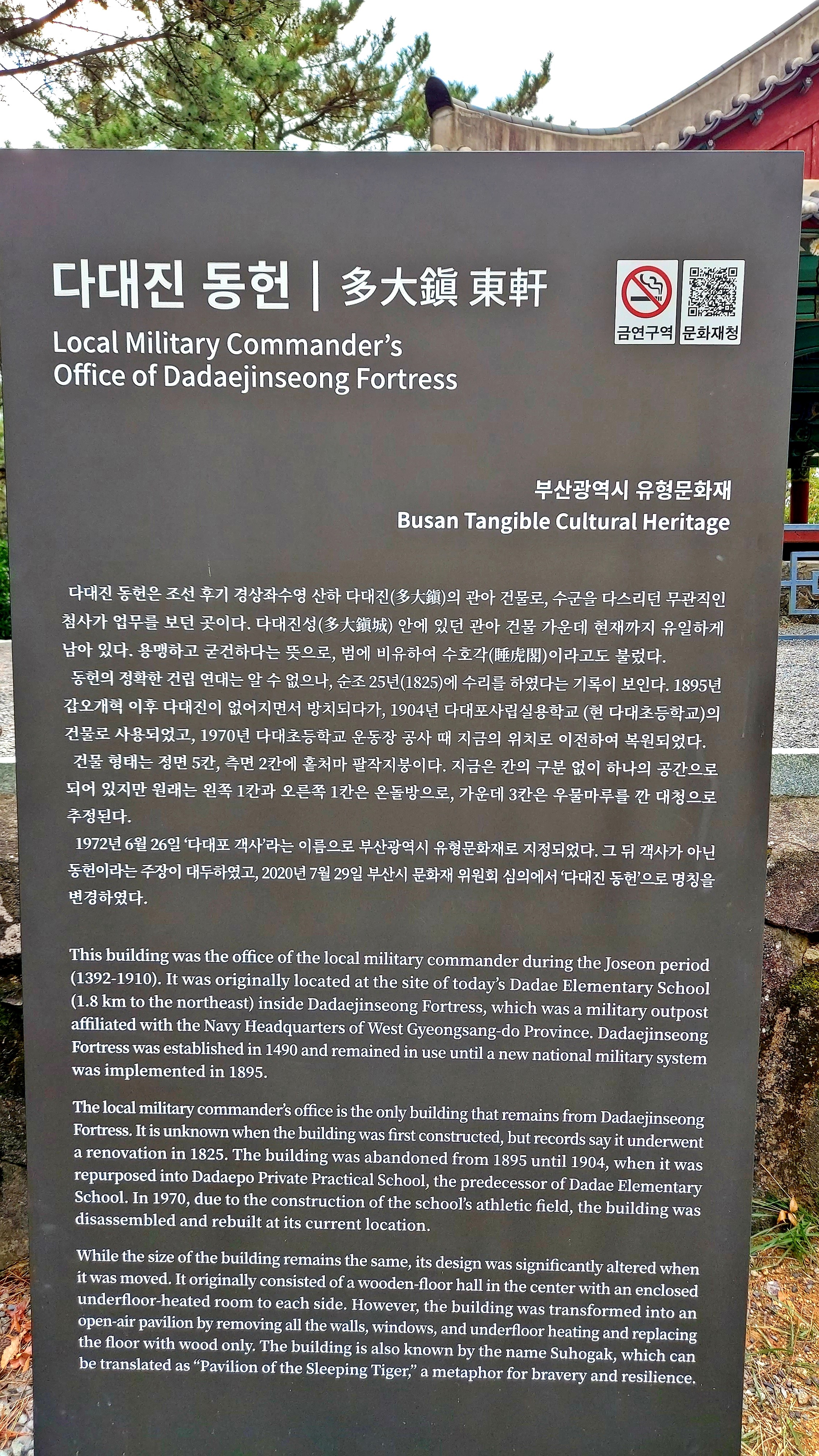 다대진 동헌은 부산광역시 유형문화재로 경상좌수영 산하 다대진 관아 건물로 첨사가 업무를 보던 곳이다.