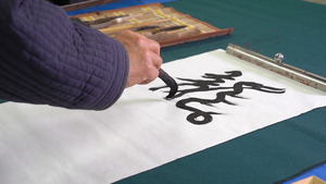 삼나무 붓으로 한지 위에 용(龍) 자를 쓰고 있는 모습.