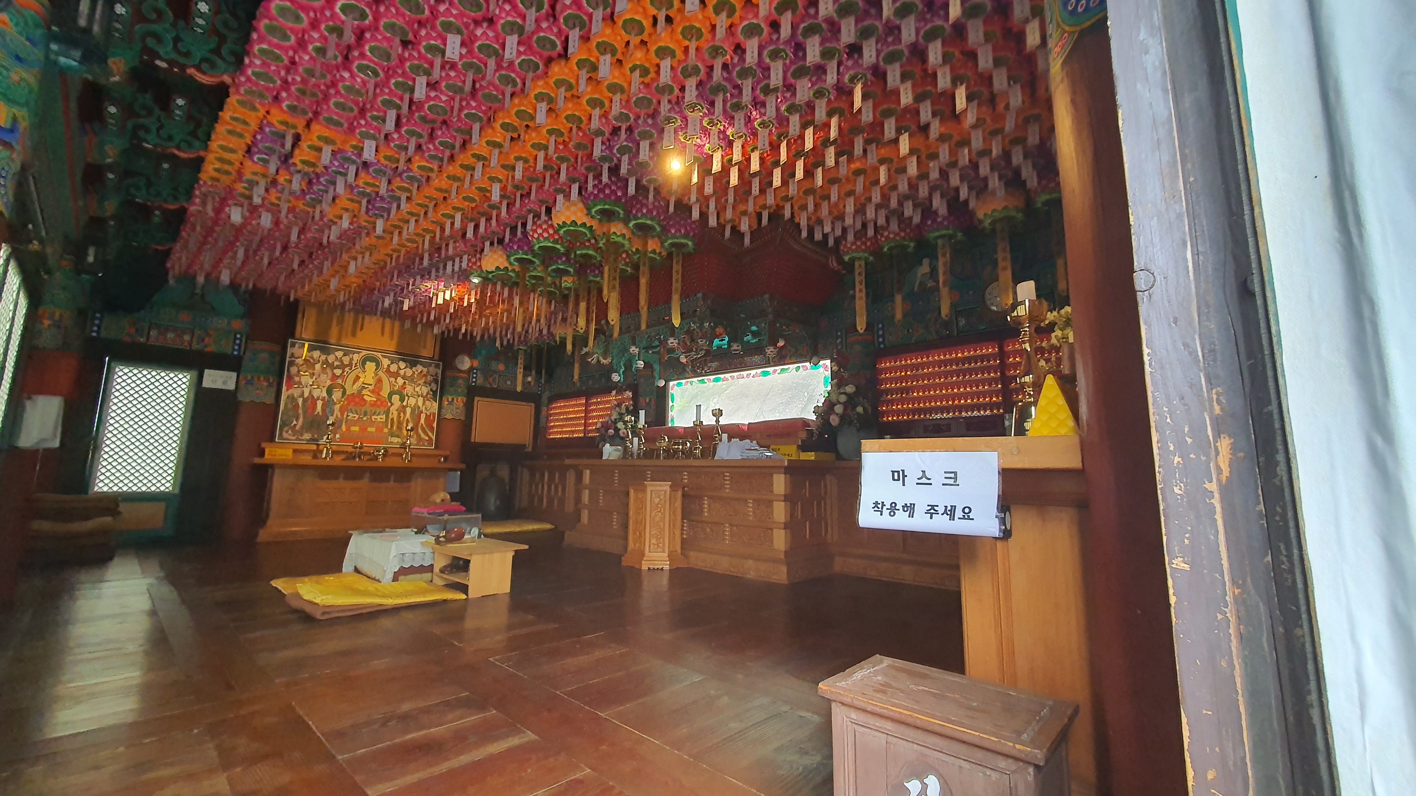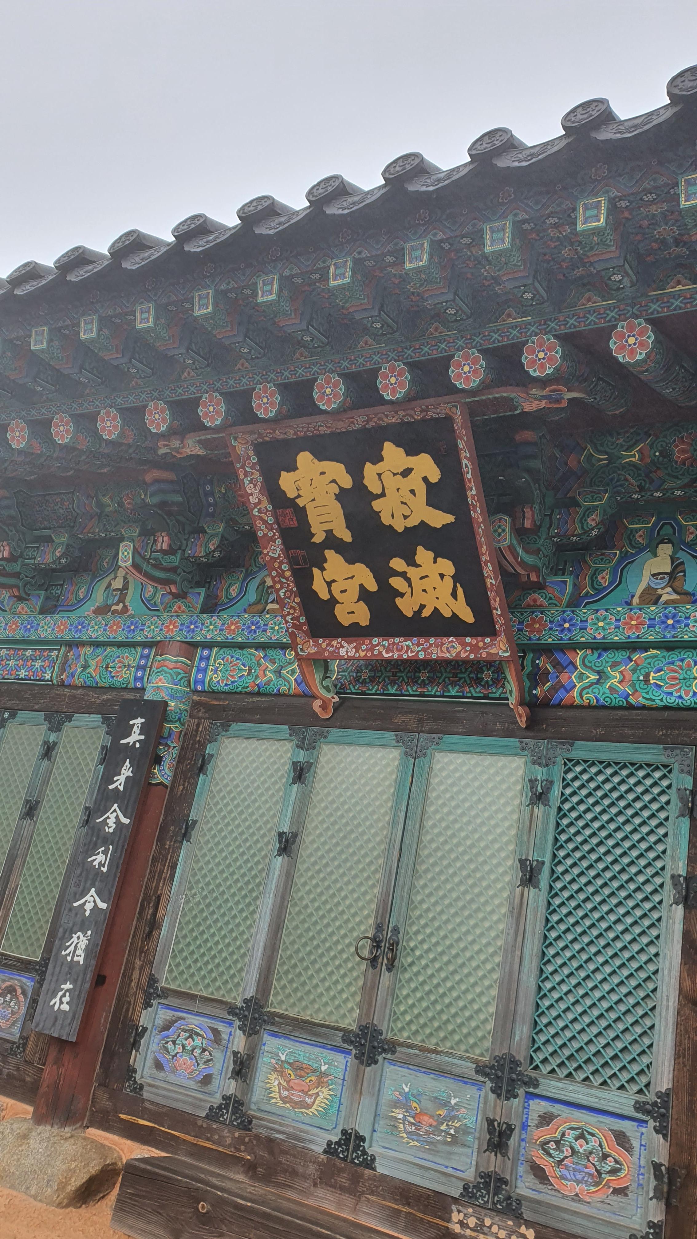 법계사는 적멸보궁이라 부처님이 모셔져 있지 얺고, 직사각형 유리 밖으로 큰바위 위애 사리탑이 보인다.