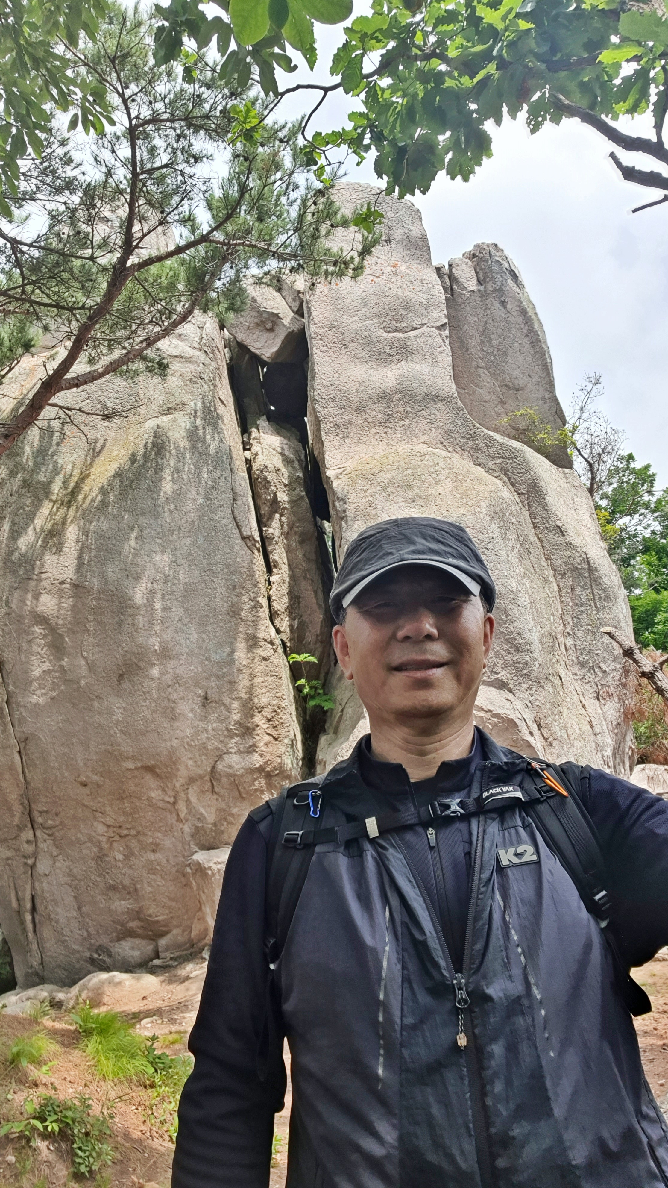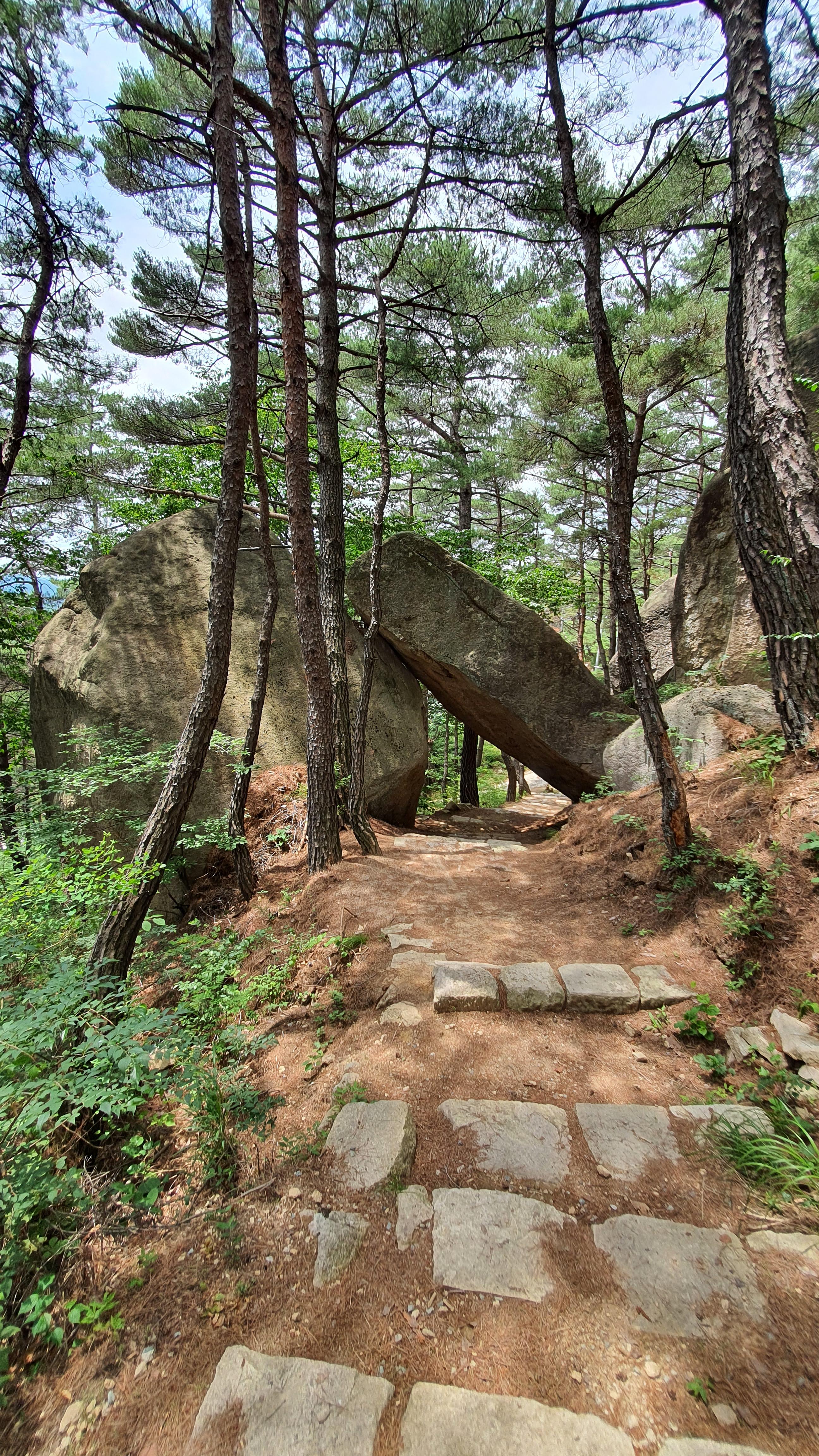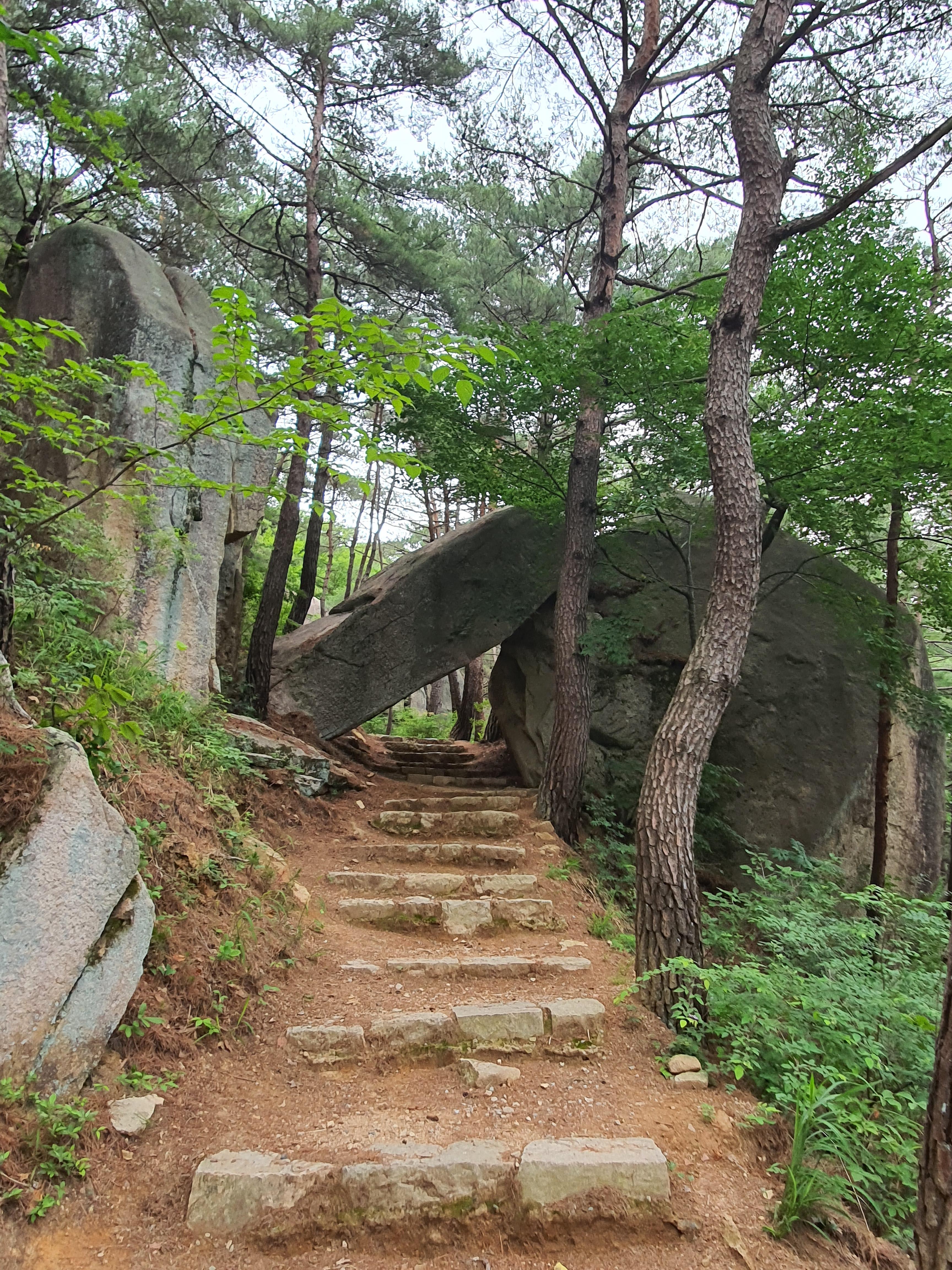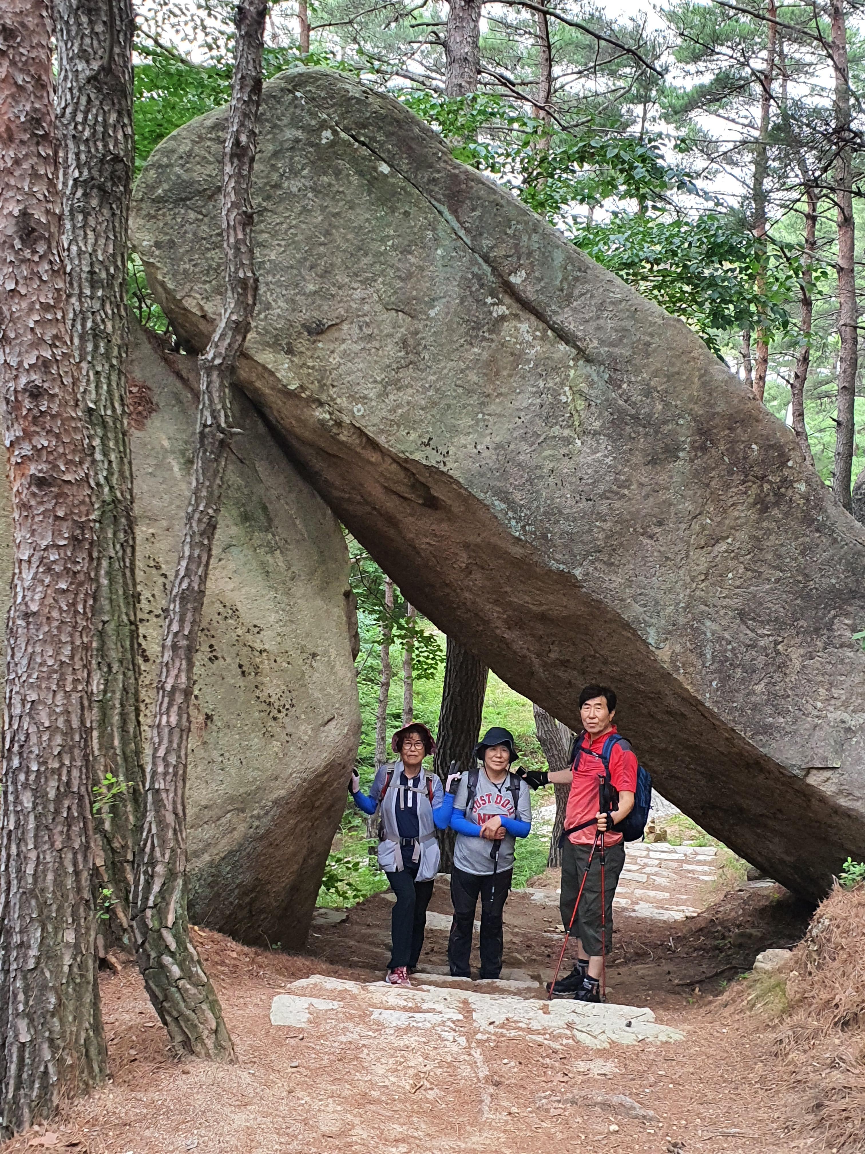등산로 초입인 용문사 입구의 길은 기울어진 거대한 바위 석문 아래를 지나면서 시작된다.