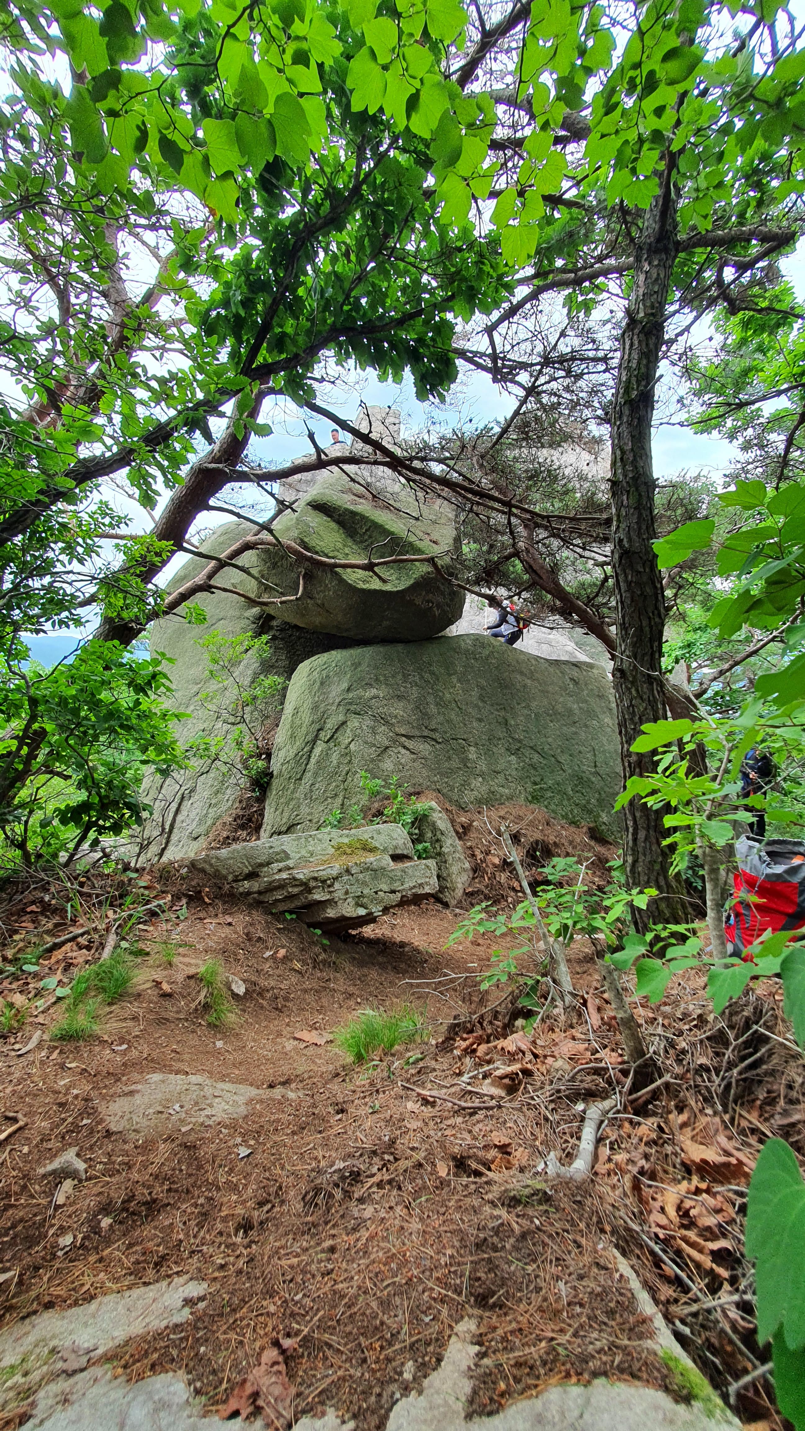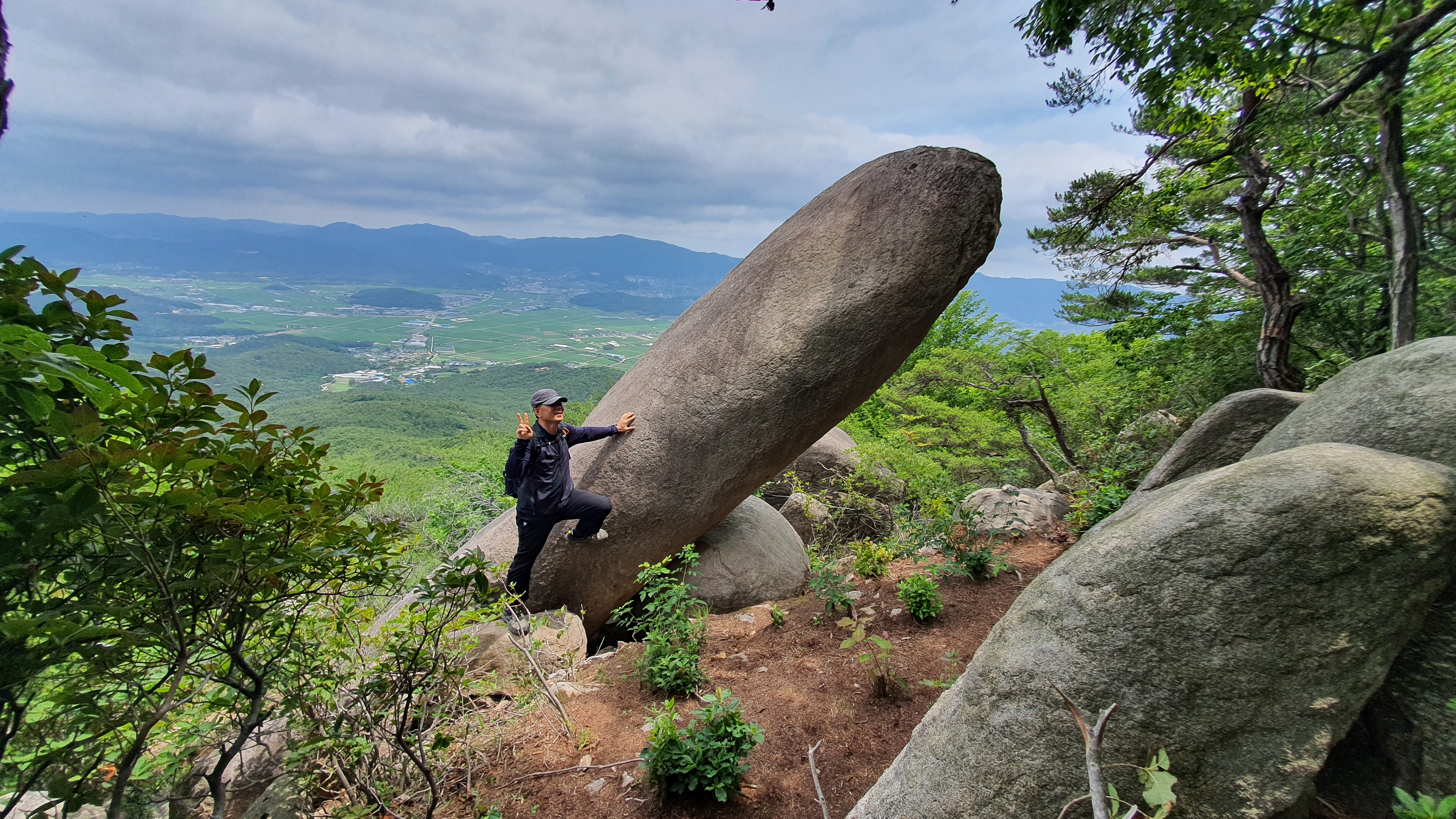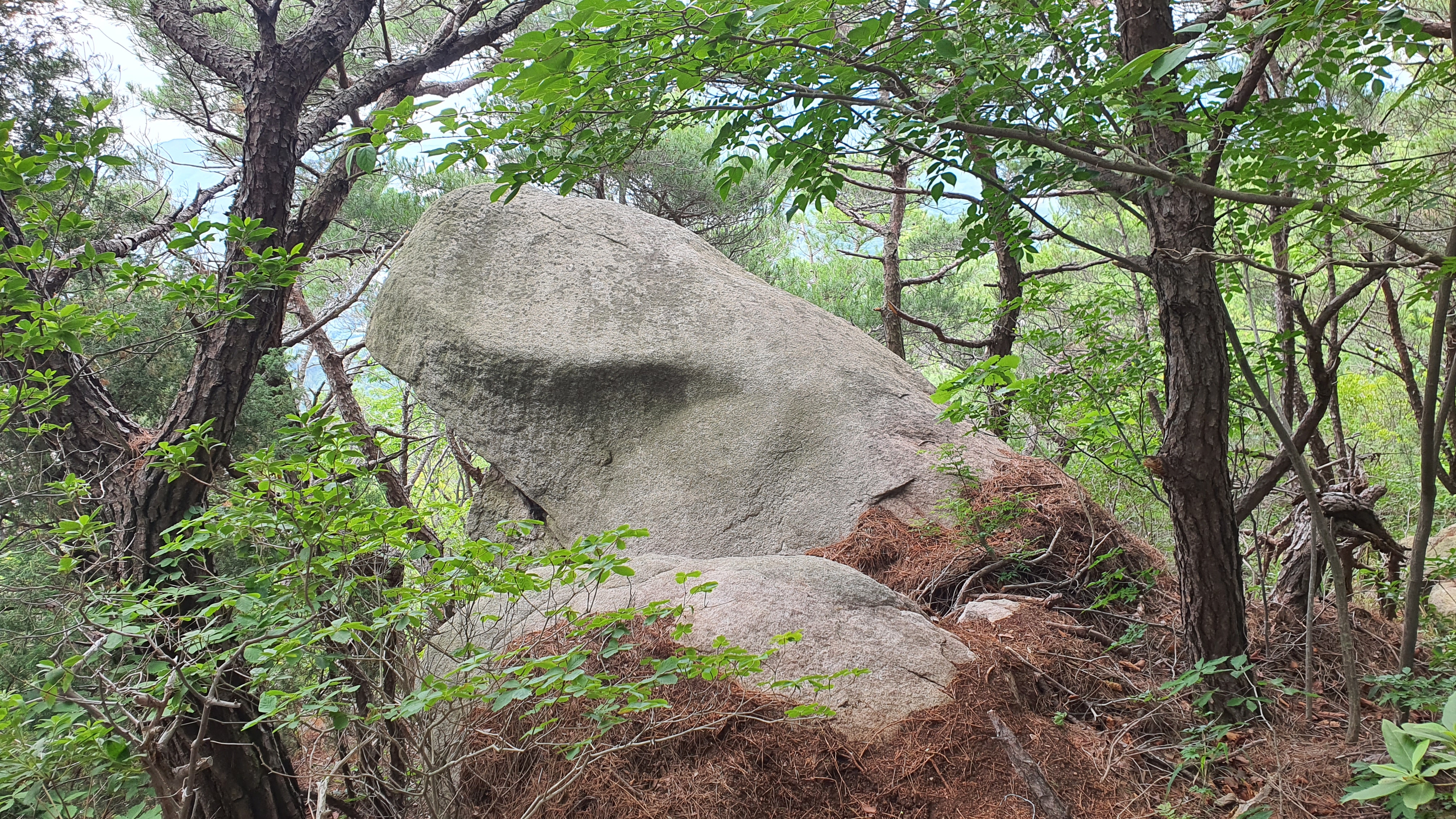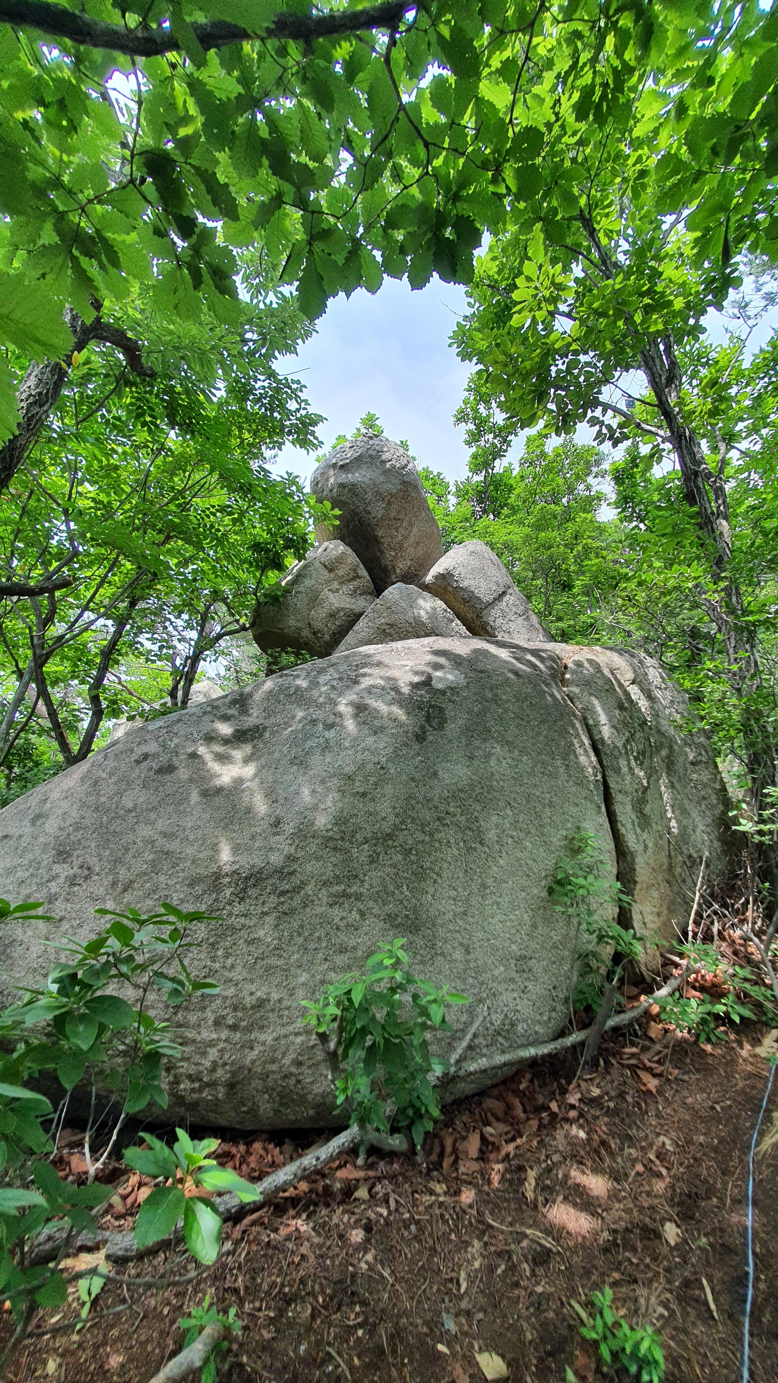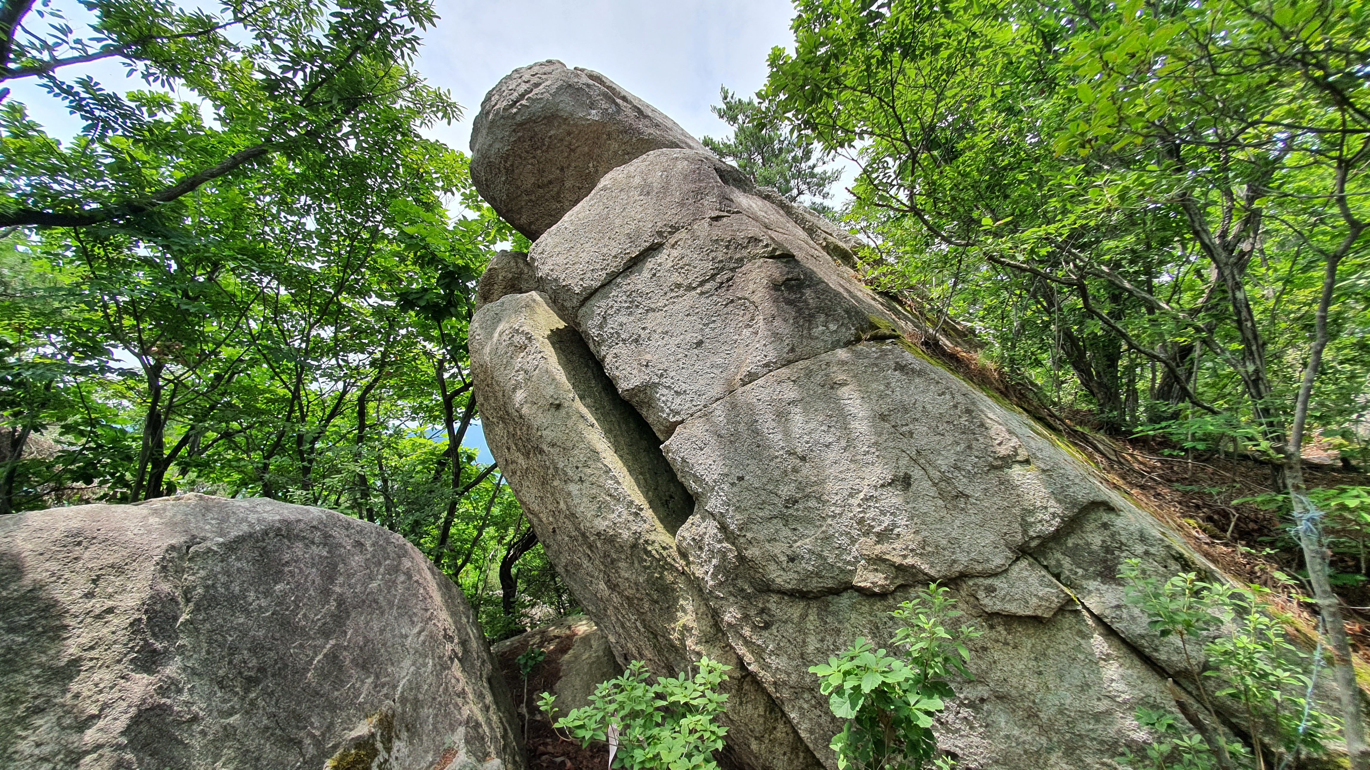 정상에서 동쪽으로 100m 내려가 맷돌바위 도착전에 유두바위 대포바위를 먼저 보고 맷돌바위로 가면된다.