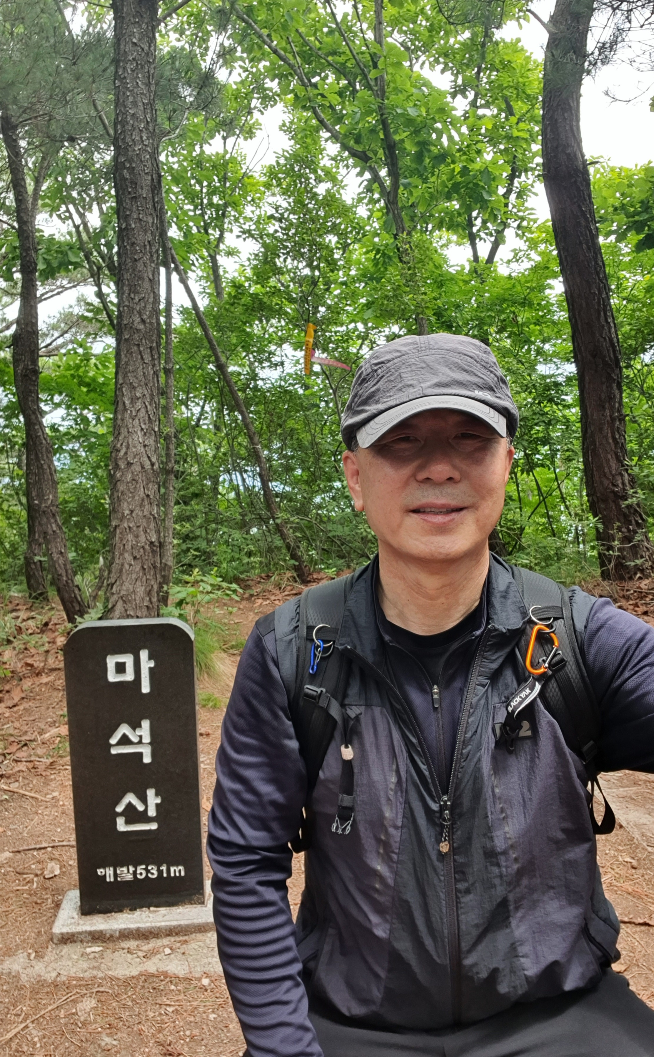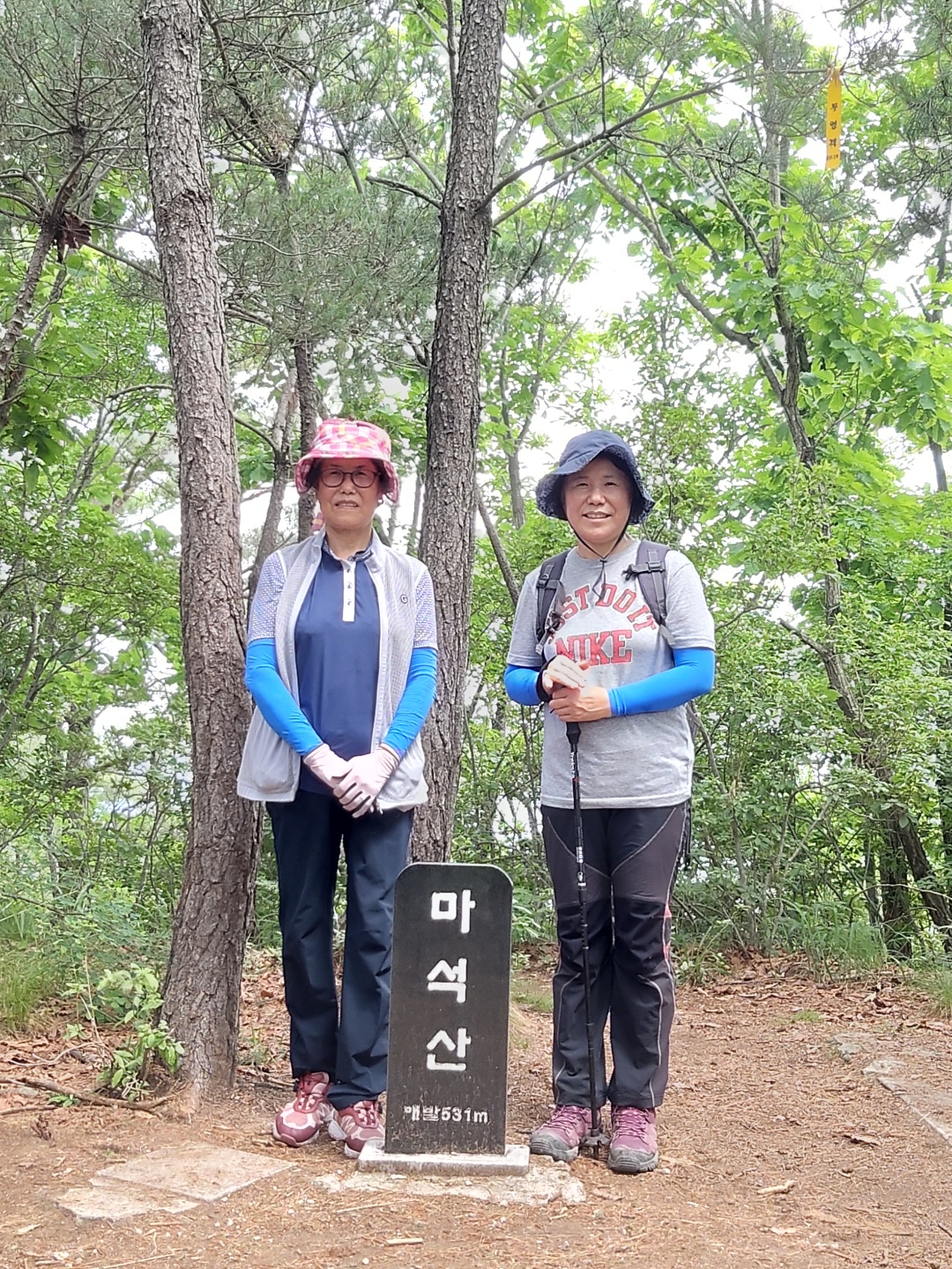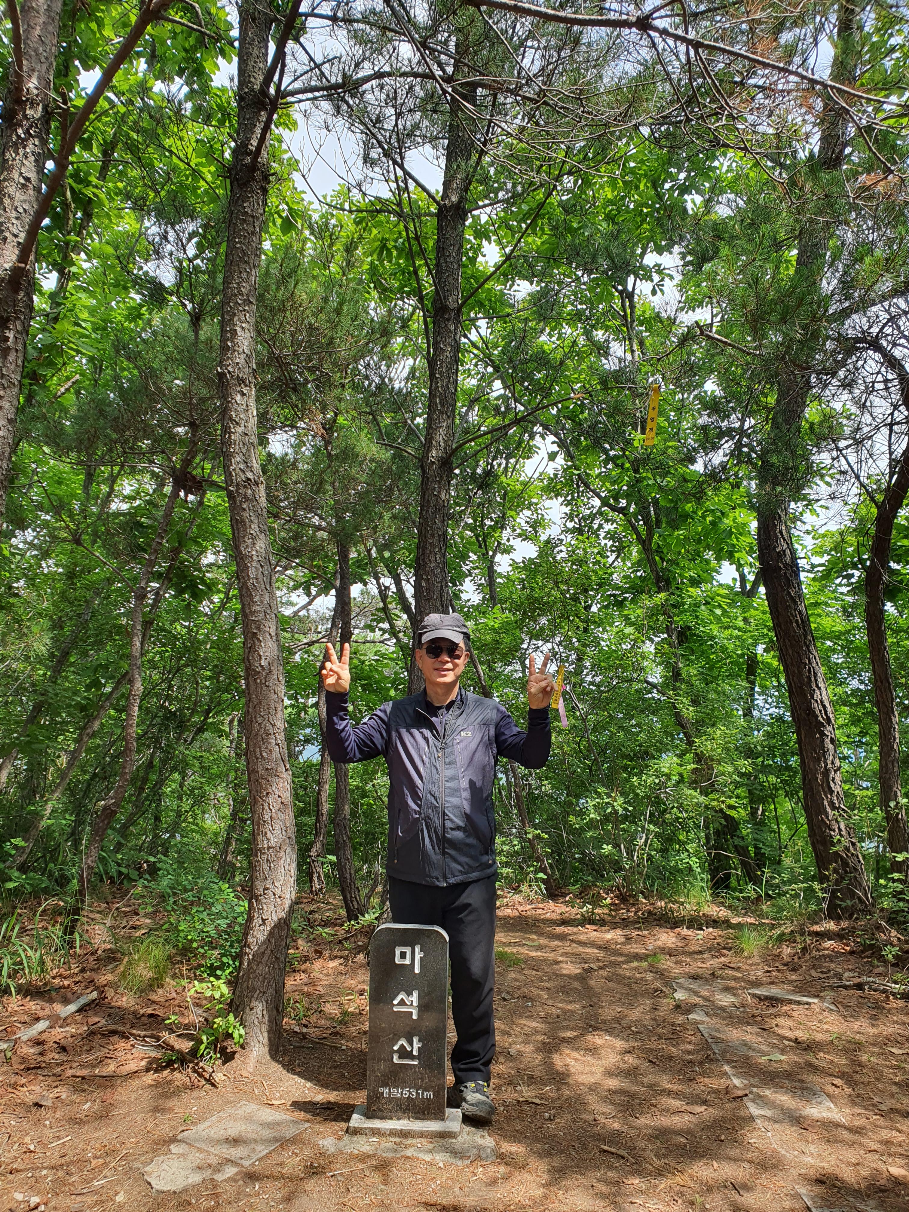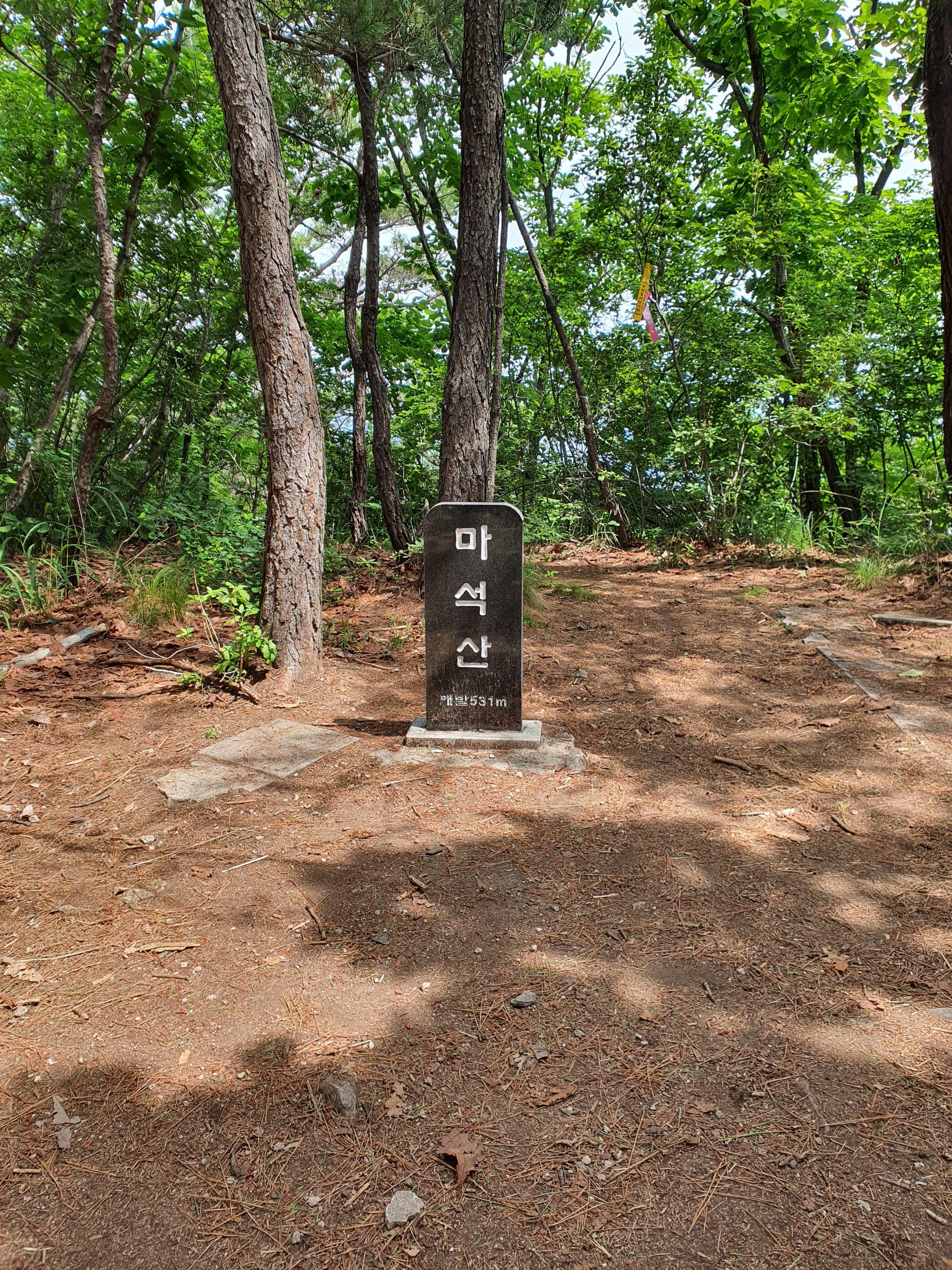 정상에는 검은색 비석형태의 마석산 정상석(531m)이 놓여 있고 소나무에 둘러싸여 있어 이 곳의 조망은 없다.