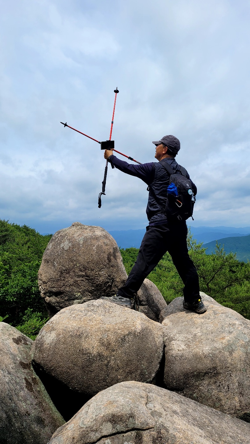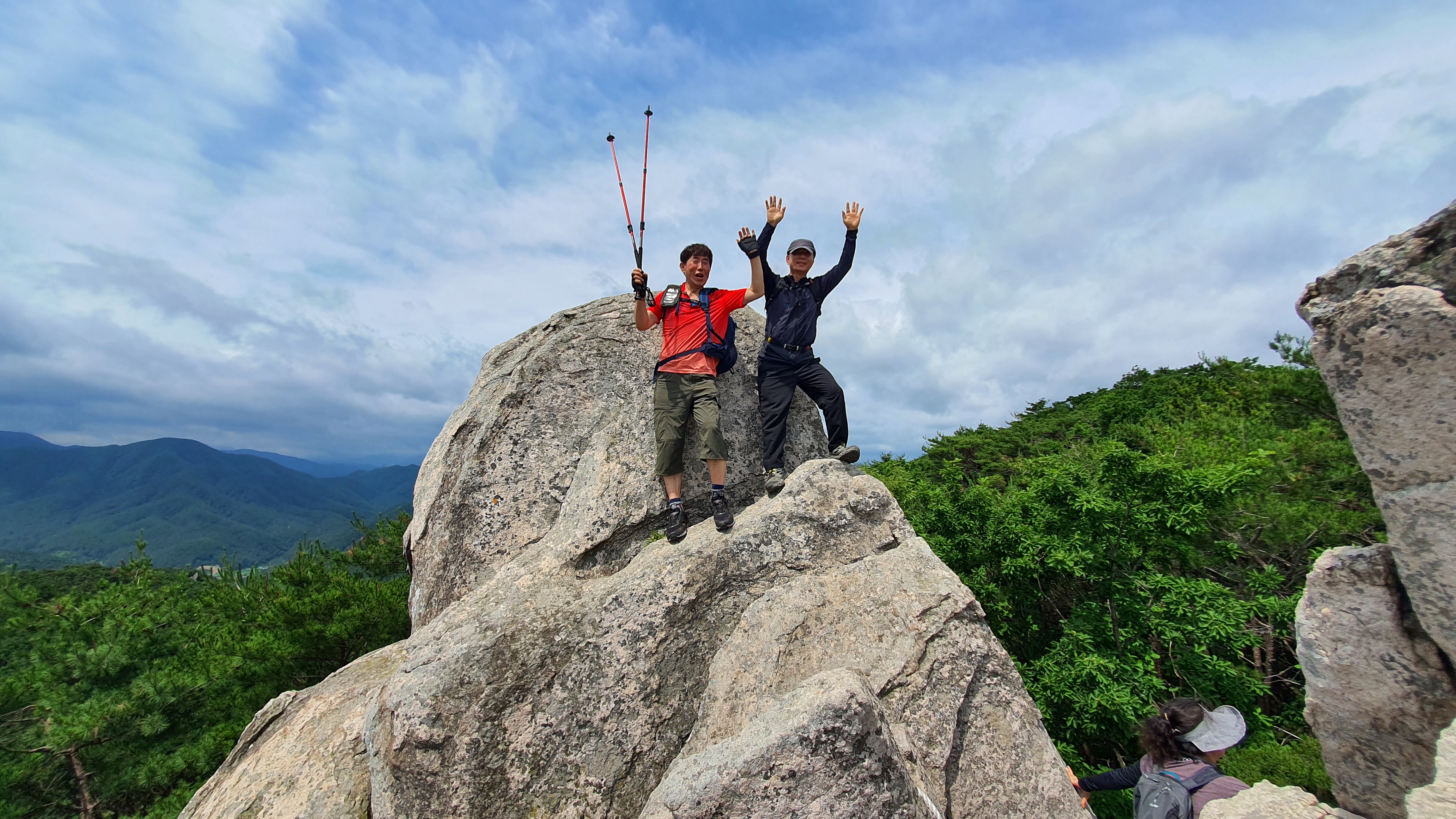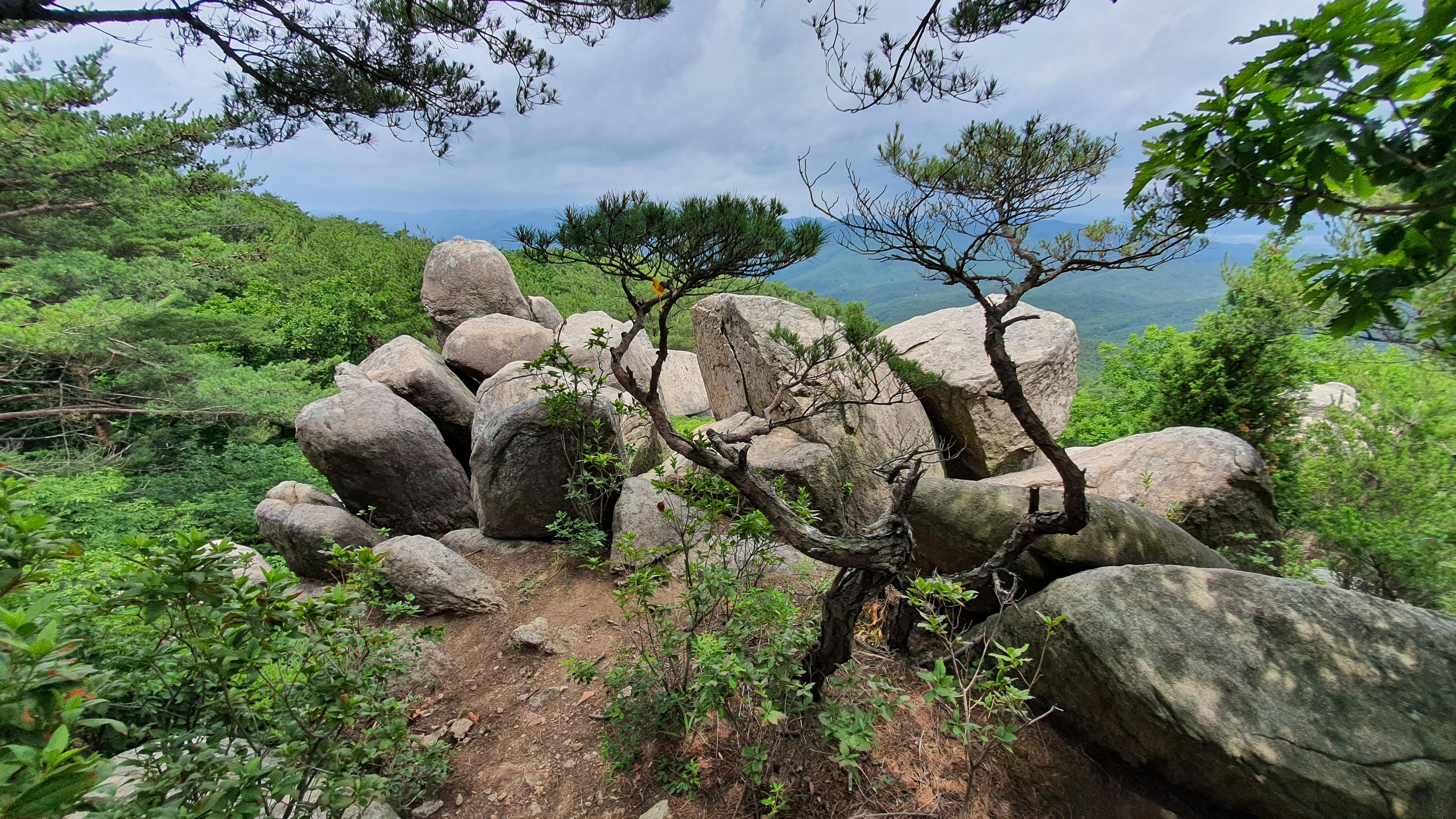암석군이 있는 곳은 동쪽 사면방향으로 1km 정도 내려가야 한다고 하는데, “촛대바위(선바위)” 와 3개의 뾰족한 바위가 비스듬하게 하늘을 가리키고 있는 “삼지창 바위” 그리고 가시개 바위 등은 다음에 기회가 있으면 만나 보기로 하고 하산을 하기로 한다.