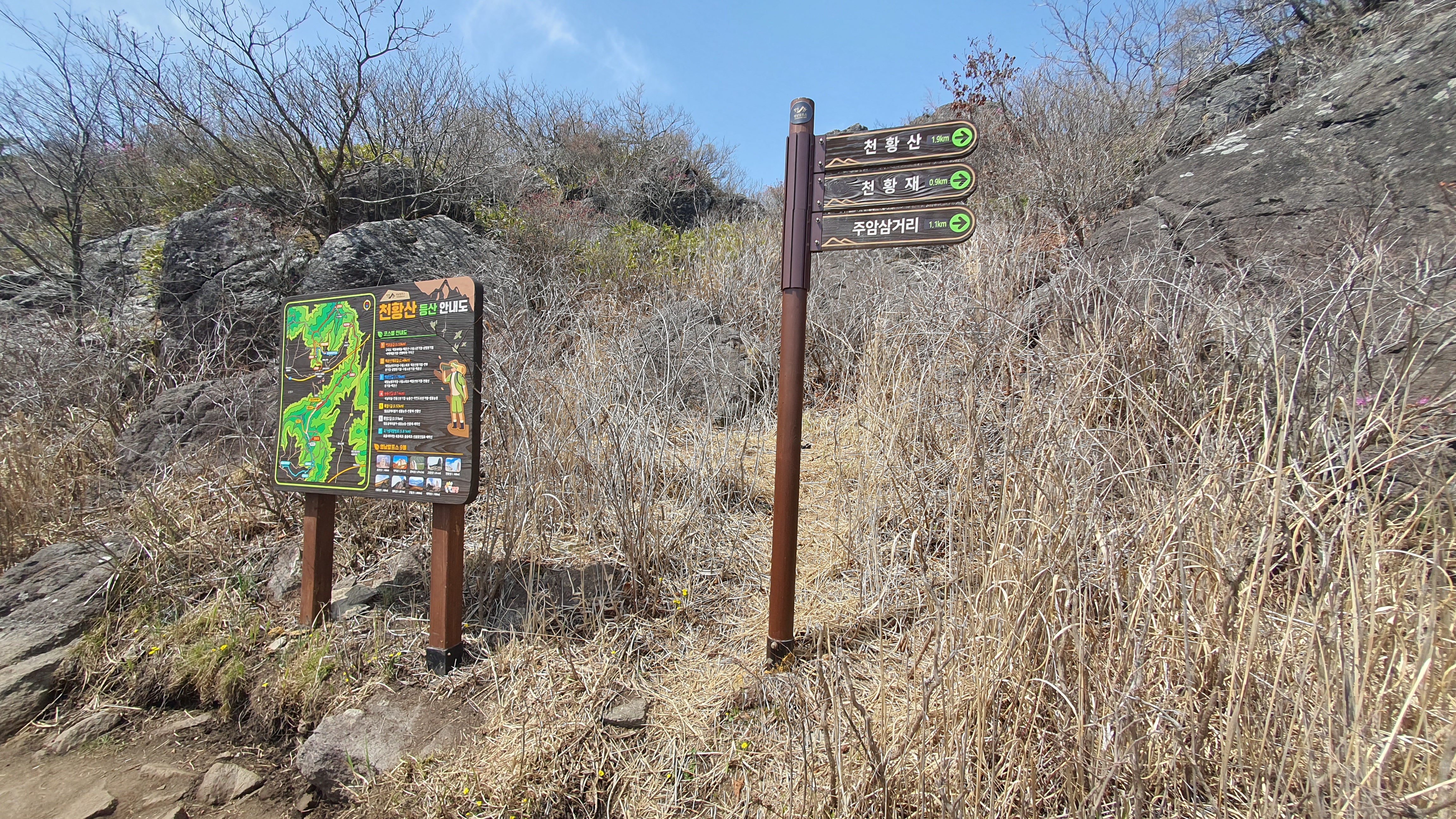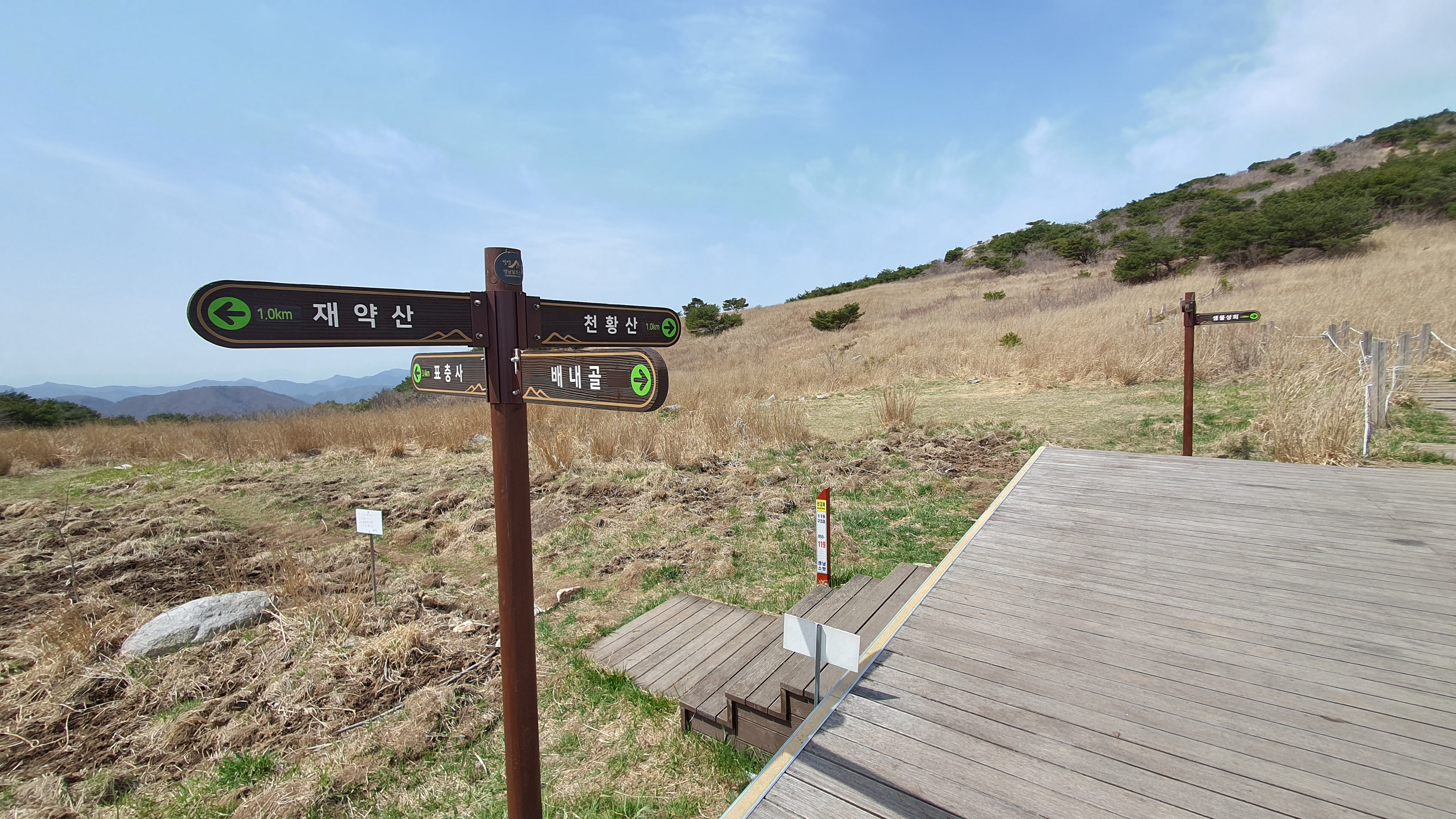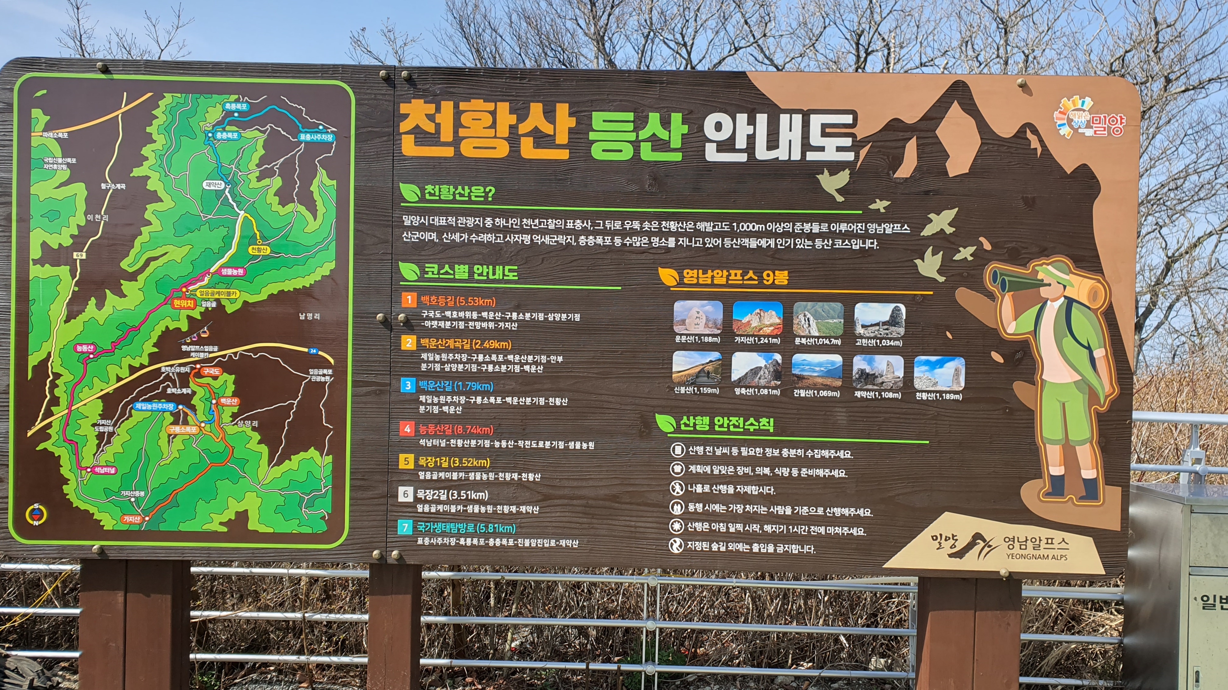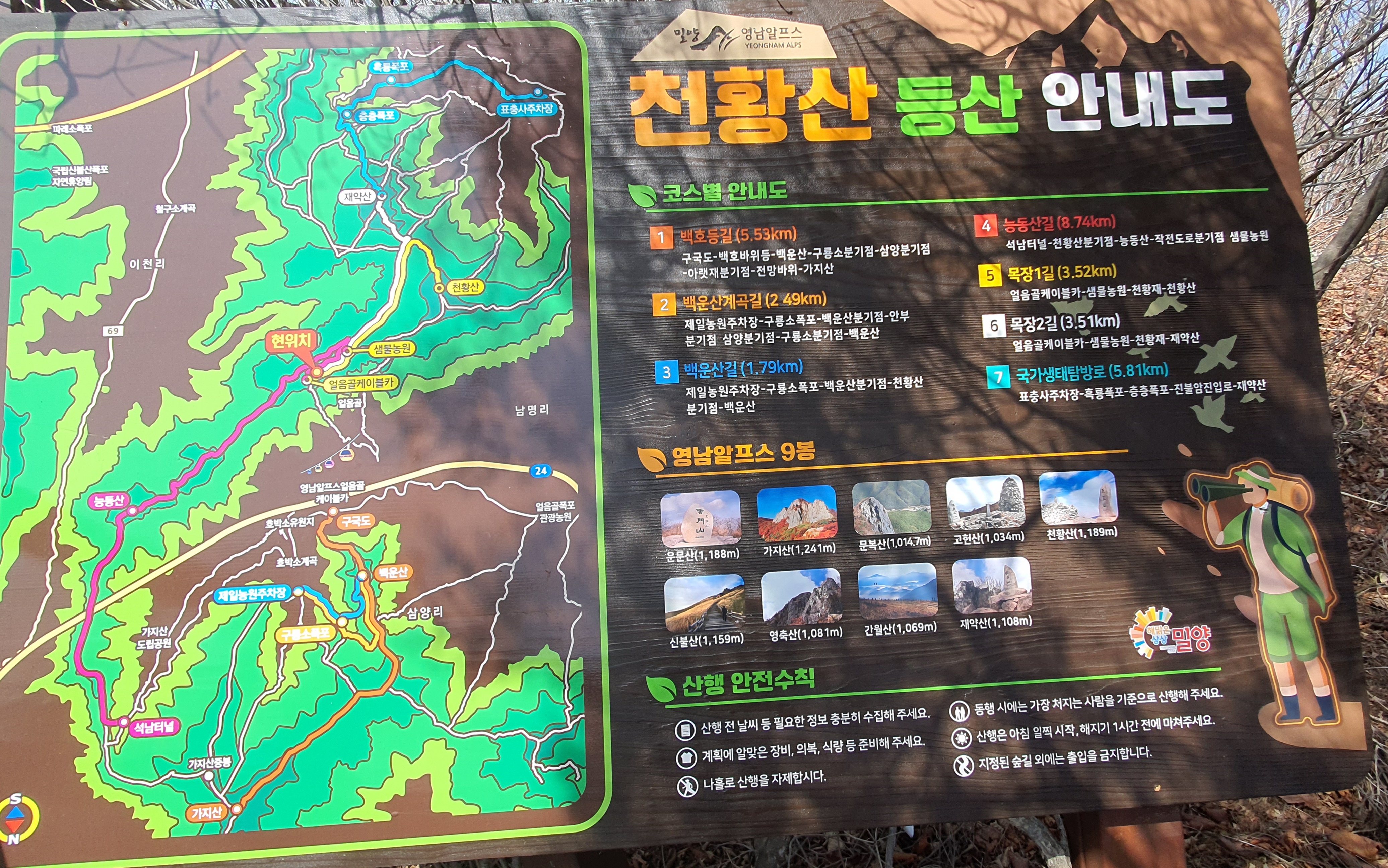 밀양 얼음골에서 케이블카를 타고, 상부터미널에서 하차후 10분 정도 걸으면 샘물산장이 나오는데 이곳에서 천황산까지 1시간, 재약산까지 약 1시간 정도 걸립니다.