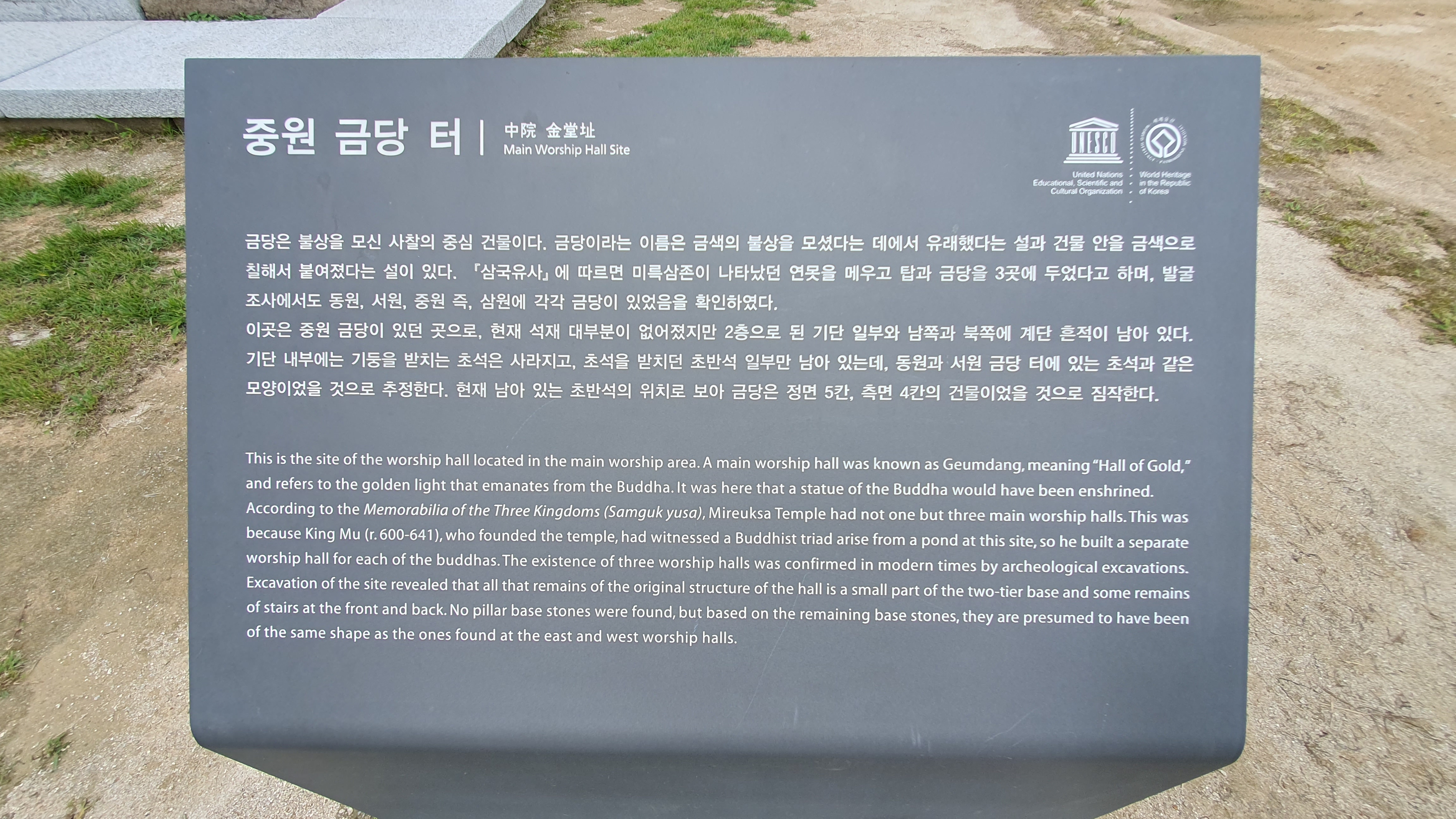 미륵사는 중문-탑-금당이 일직선상에 배열된, 이른바 백제식 <1탑-1금당> 형식의 가람 세 동을 나란히 병렬시켜 특이한 구조를 이루고 있다. 물론 양쪽의 동원(東院)과 서원(西院)보다는 가운데 중원(中院)의 면적과 금당 및 탑의 규모가 더 커 중심을 형성하였다.
