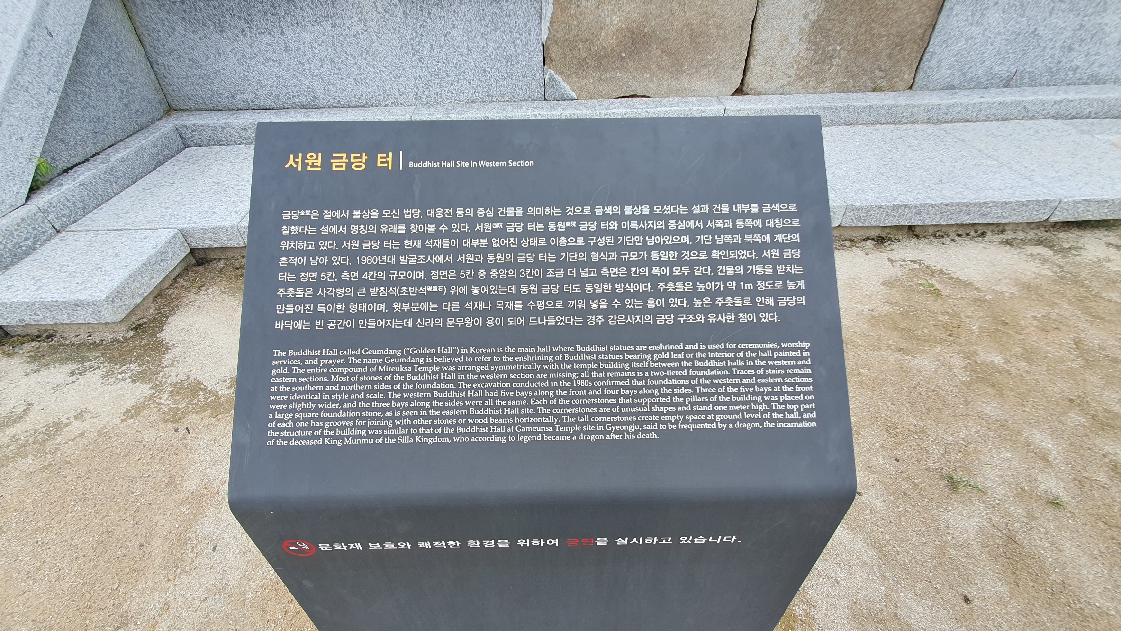 동중서(東中西) 3개 원은 각기 긴 회랑으로 구획되어 독립된 공간을 이루지만, 북쪽으로는 1동의 큰 강당터로 연결된다. 즉 예불공간을 3개 원으로 분화되었지만, 강당은 하나로 전체를 통합하는 역할을 한다. 강당과 연결된 북·동·서 회랑터에는 후대 승방(僧房)으로 사용된 흔적도 발견되었다.