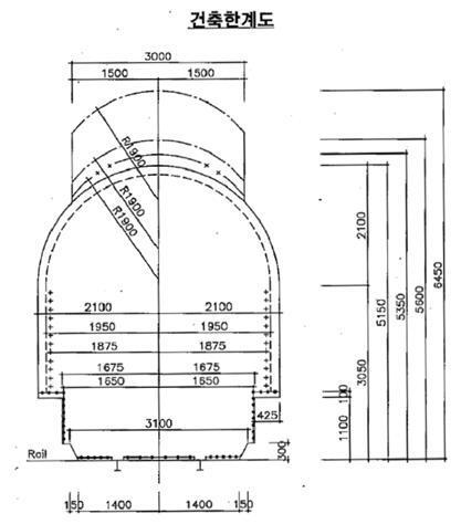 나. 직선로에 대한 건축한계 : 직선로에 대한 건축한계는 궤도중심에서 2100[mm]이며 레일면상 높이는 비전철 구간에서 5,150[mm], 전철구간에서는 6,450[mm]이다