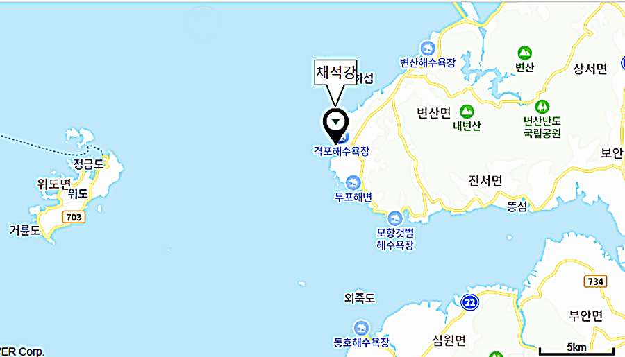 채석강은 전북 부안군 변산반도 맨 서쪽, 격포항 오른쪽 닭이봉 밑에 면적 12만 7372㎡이다.