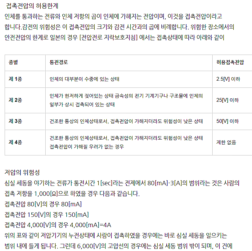 6mA × 5kΩ = 30 [V] 을 기준으로 30V 이상의 전압은 안전하지 않으며 30V 이하는 비교적 안전하다고 볼 수 있다.