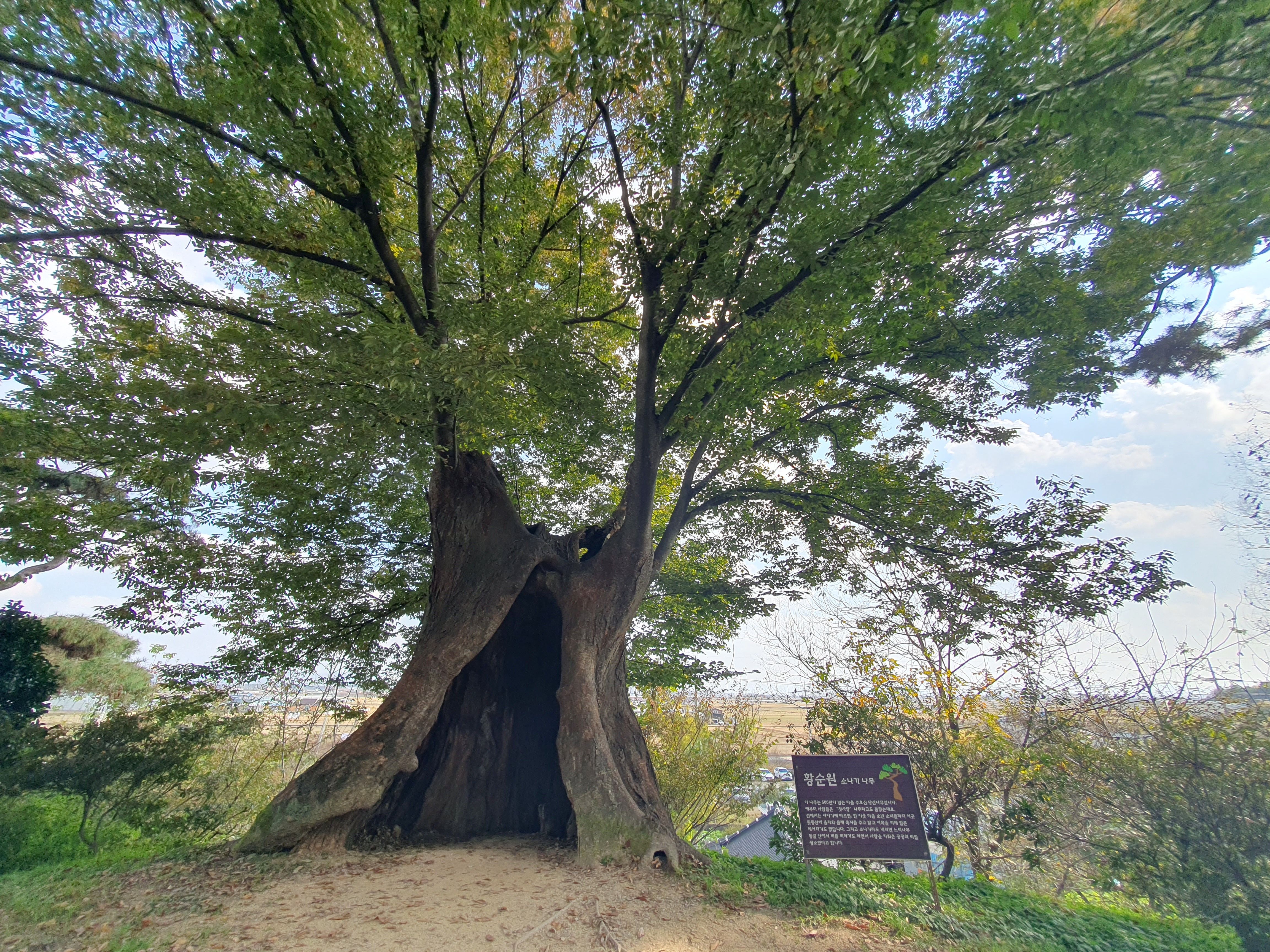달빛소리수목원에 입장하면 낮은 언덕길에서 당산나무를 만나게 되는데 황순원 소설인 소나기 나무라고 이름을 붙여 놓았습니다.