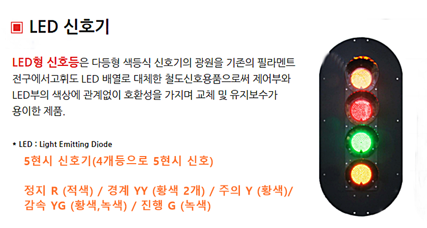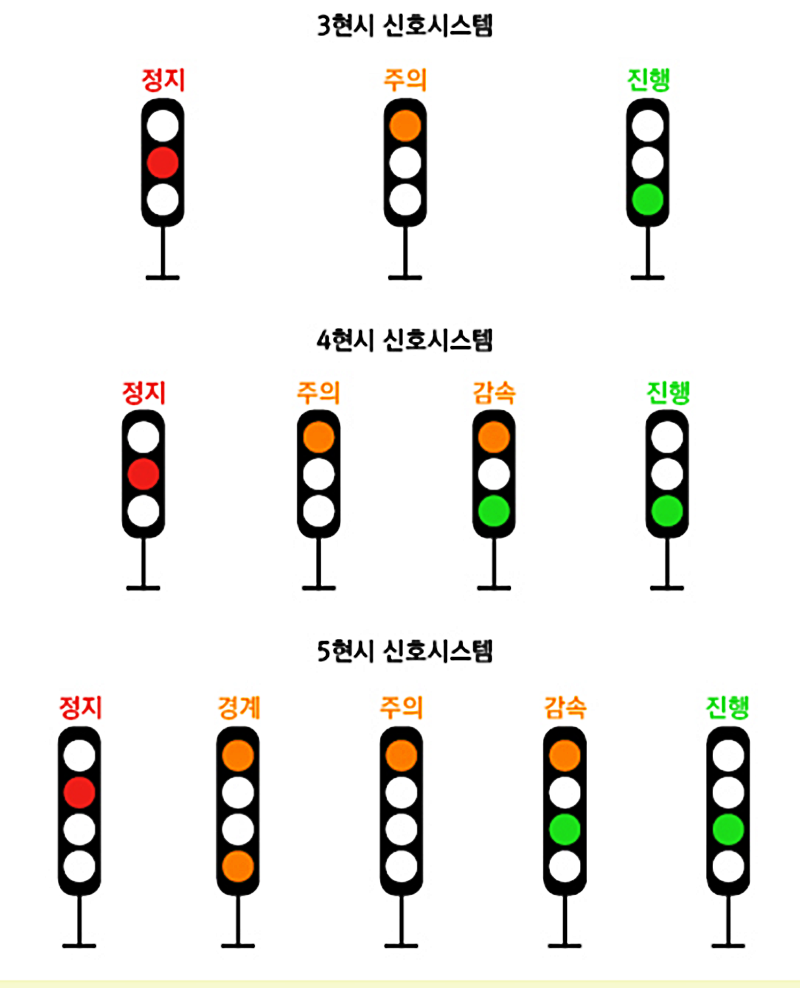 5현시 신호기는 정지 - 경계 - 주의 - 감속 - 진행 의 5갸신호가 존재하고 제한 속도가 정해져 있다.