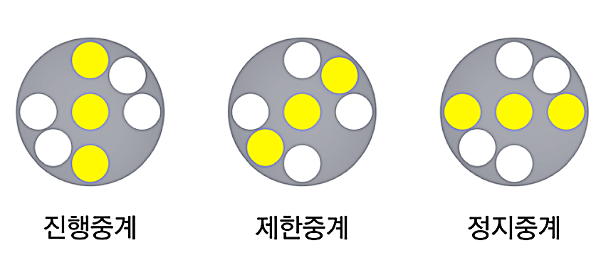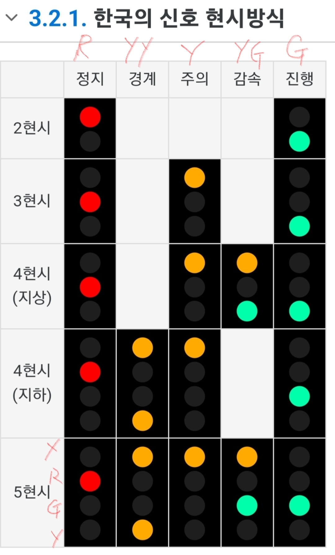 정지 R (적색) - 경계 YY (황색 2개) - 주의 Y (황색) - 감속 YG (황색,녹색) - 진행 G (녹색)