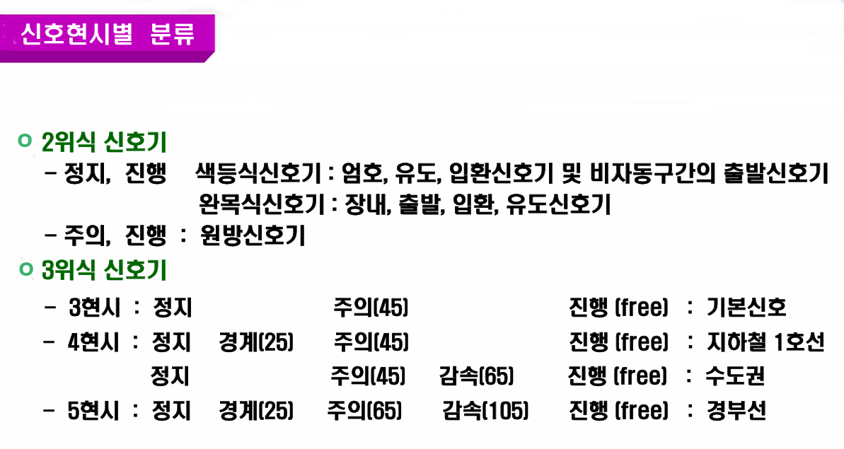 - 3위식 : 열차진로 2구간의 상태를 표시. 등이 있다.