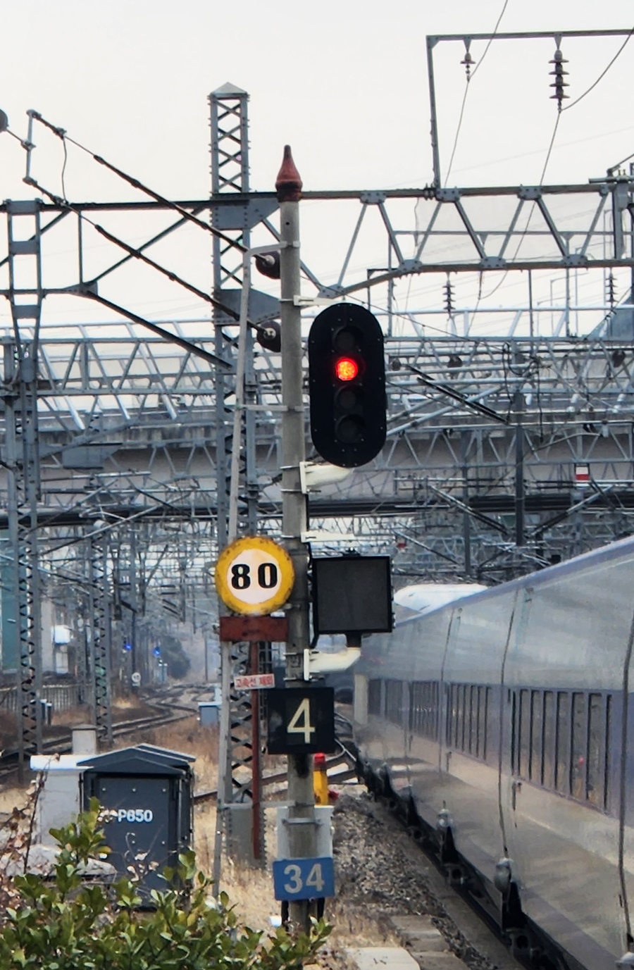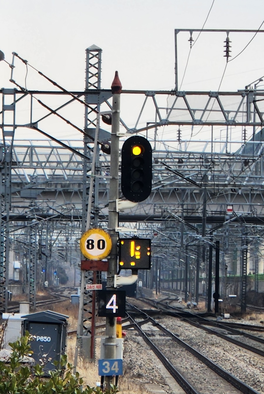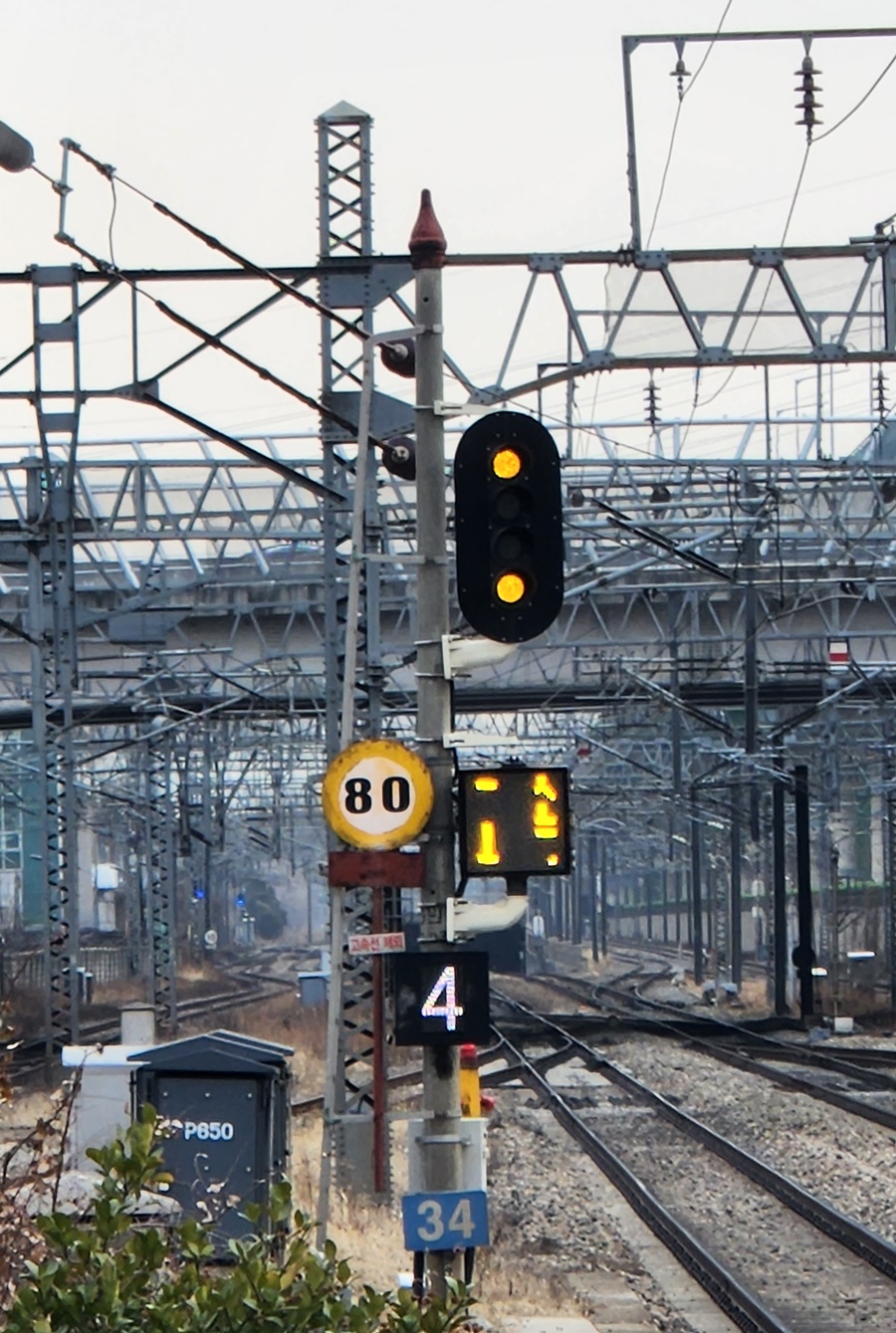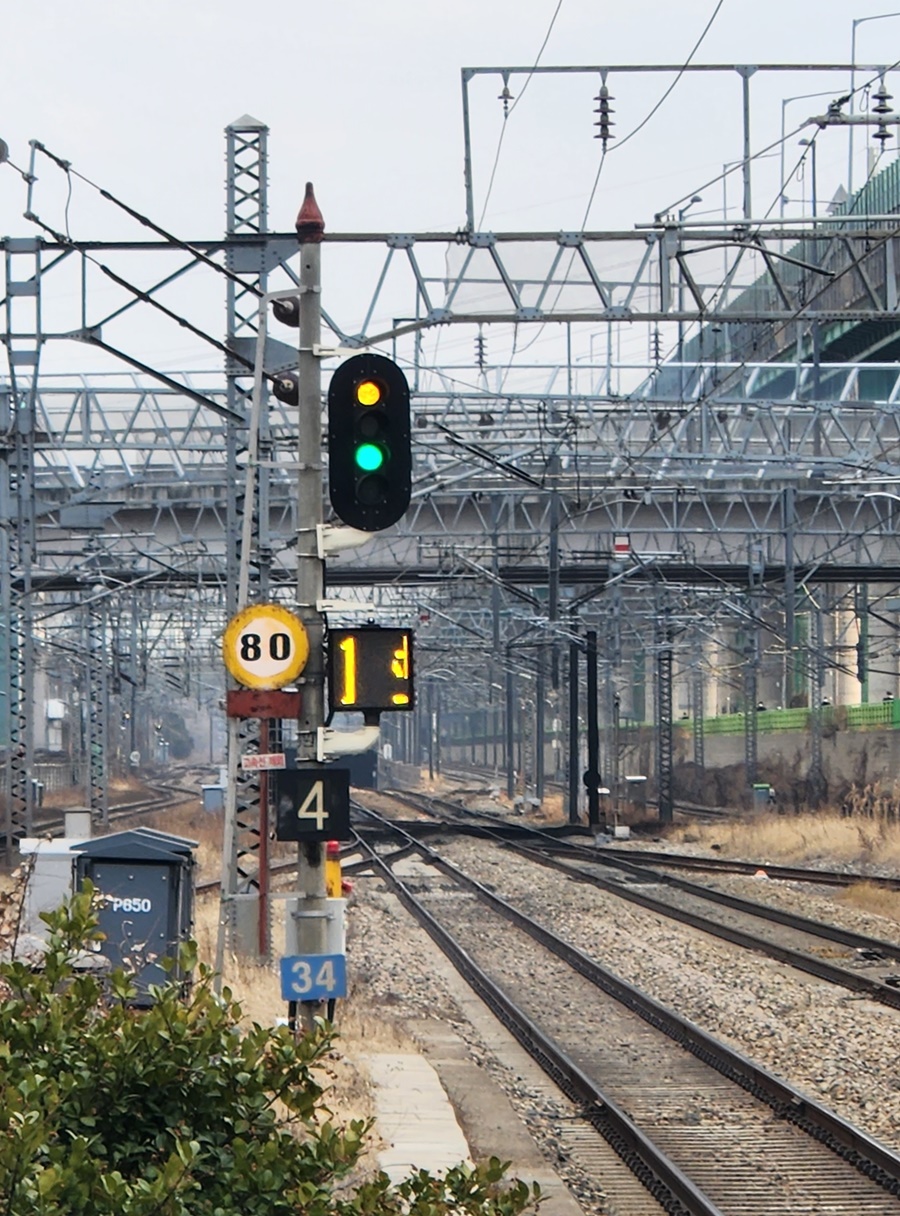열차 운행이 빈번한 곳에서 사용하는 '5현시 신호기'입니다. (4개등으로 5현시 신호)