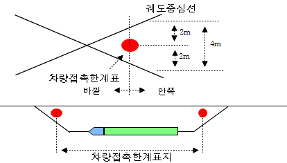 16. “차량접촉한계표지 내방”이란 차량이 접촉하지 않는 방향을 말하고, “차량접촉한계표지 외방”이라 함은 차량이 접촉하는 방향을 말한다.