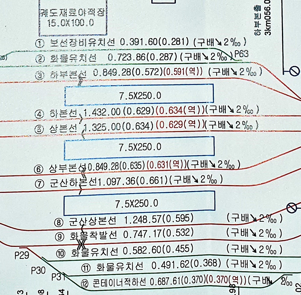 27) 장비유치선 : 선로 유지보수 장비를 유치하는 선으로 선로차단 시간 내 유지보수 작업을 효율적으로 해야 하므로 가능한 측선이 계획된 정거장에 설치가 요망