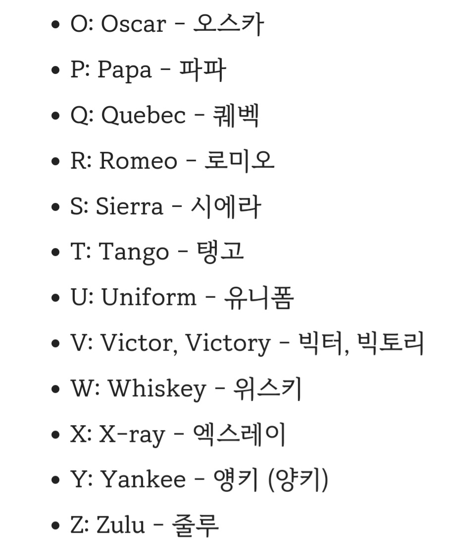 | A - 알파(Alfa). B - 브라보(Bravo). C - 찰리(Charlie). D - 델타(Delta). E - 에코(Echo). F - 폭스트롯(Foxtrot). G - 골프(Golf). H - 호텔(Hotel). I - 인디아(India). J - 줄리엣(Juliet). K - 킬로(Kilo). L - 리마(Lima). M - 마이크(Mike). N - 노벰버(November). O - 오스카(Oscar). P - 파파(Papa). Q - 퀘벡(Quebec). R - 로미오(Romeo). S - 시에라(Sierra). T - 탱고(Tango). U - 유니폼(Uniform). V - 빅터(Victor). W - 위스키(Whiskey). X - 엑스레이(X-ray). Y - 양키(Yankee). Z - 줄루(Zulu). |