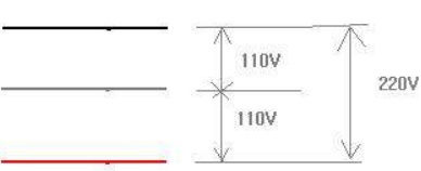양쪽 끝부분 전원선끼리 두가닥을 접속하면 220V 의 전압을 얻을 수 있고 전원선 한가닥과 가운데 중성선을 접속하면 110V를 얻을수 있으며 약 25년전 110, 220 동시 수용가의 전력 공급방식 있 었을 때 사용하던 전원 방식입니다.