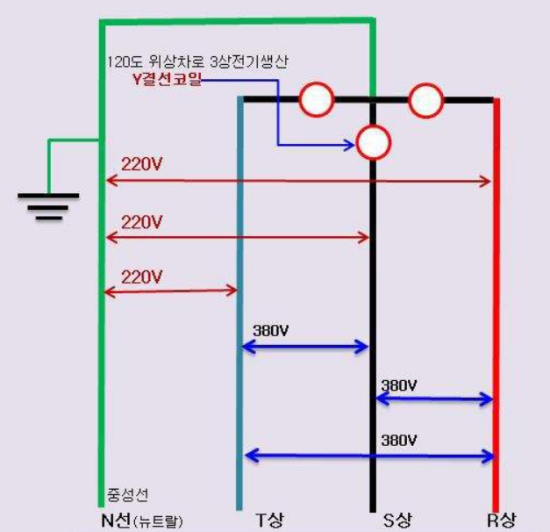 ☞3상이란 교류, 즉 일정한 파도 형식으로 타이밍이 120도 다른 3개의 파도가 각각의 선으로 들어오고, 3개를 합치면 380V전기 사용할 수 있고, N상에 각각 하나씩 사용하면 220V 전기를 사용할 수 있습니다.