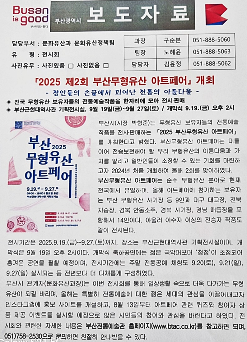 “2025 부산무형유산 아트페어” 전시회에 많은 참여와 관심을 가져 보시기 바랍니다.