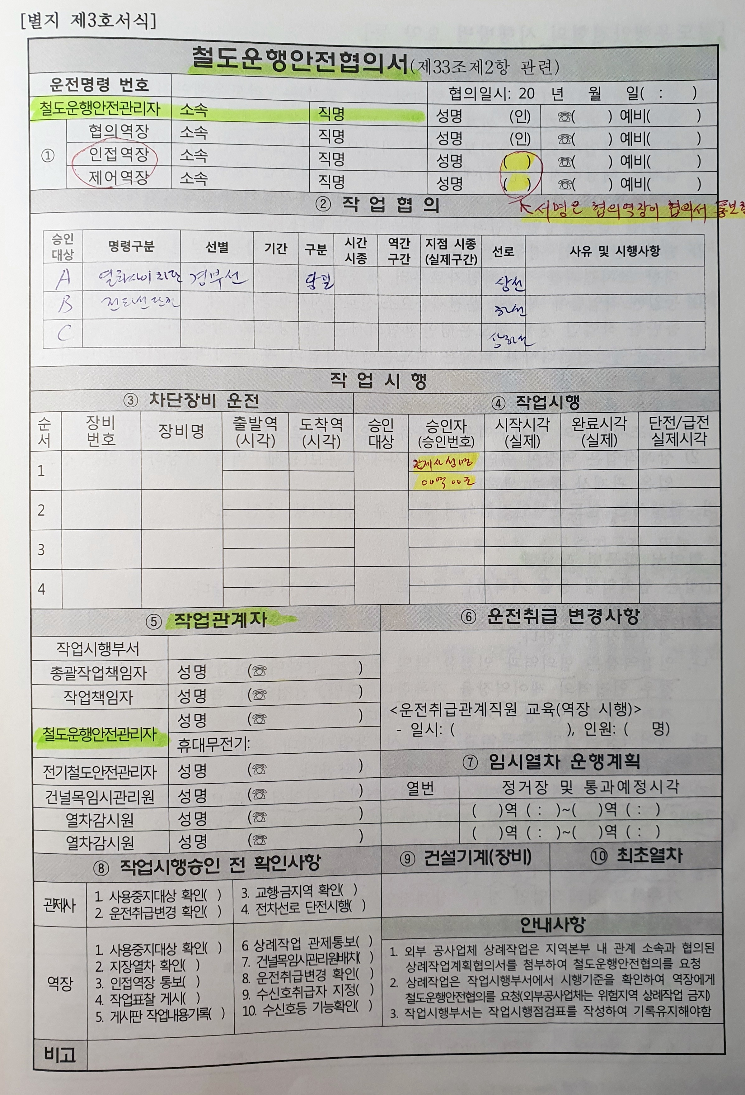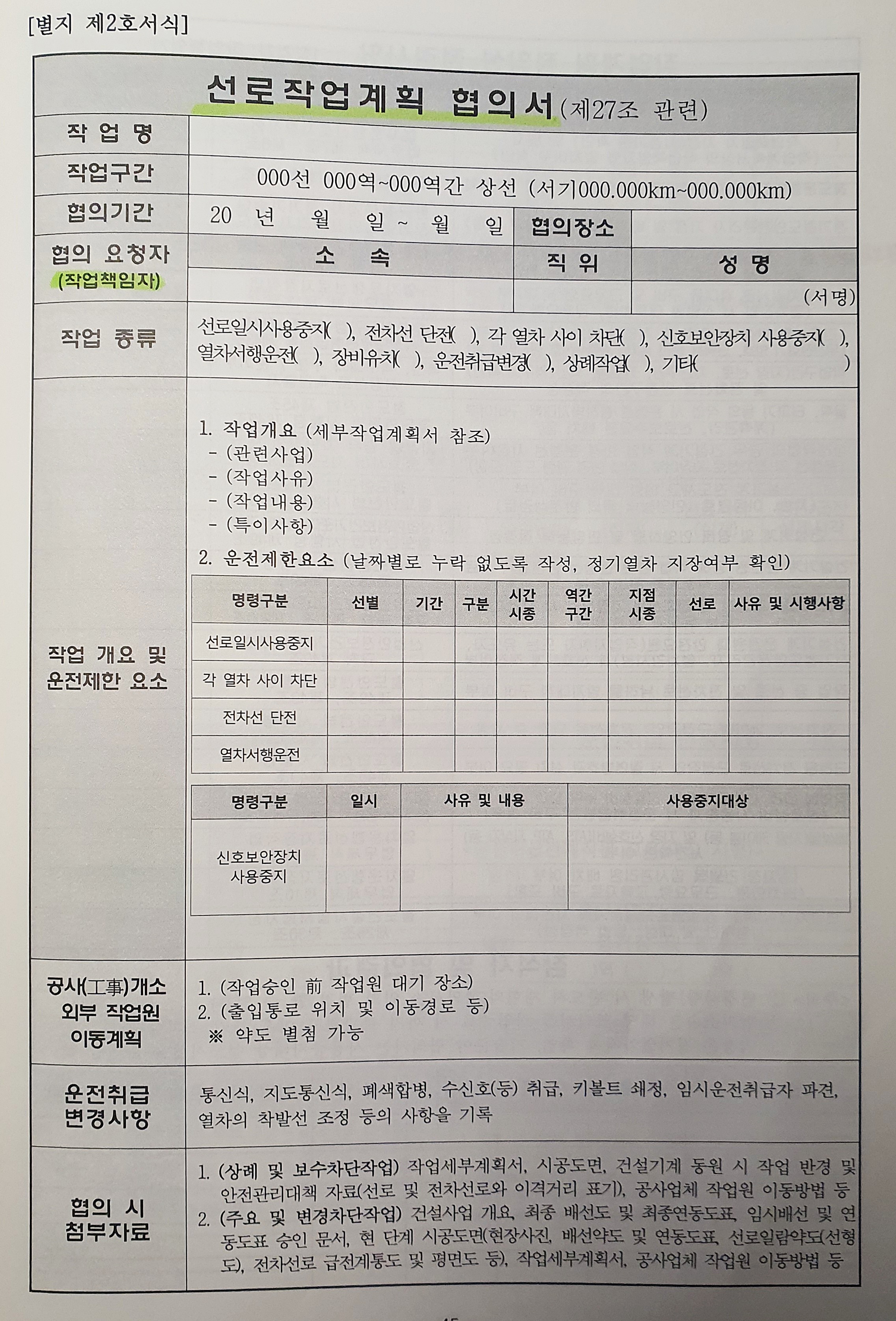 | 작업 종류 | 선로일시사용중지( ), 전차선 단전( ), 각 열차 사이 차단( ), 신호보안장치 사용중지( ), 열차서행운전( ), 장비유치( ), 운전취급변경( ), 상례작업( ), 기타( ) | ||||||