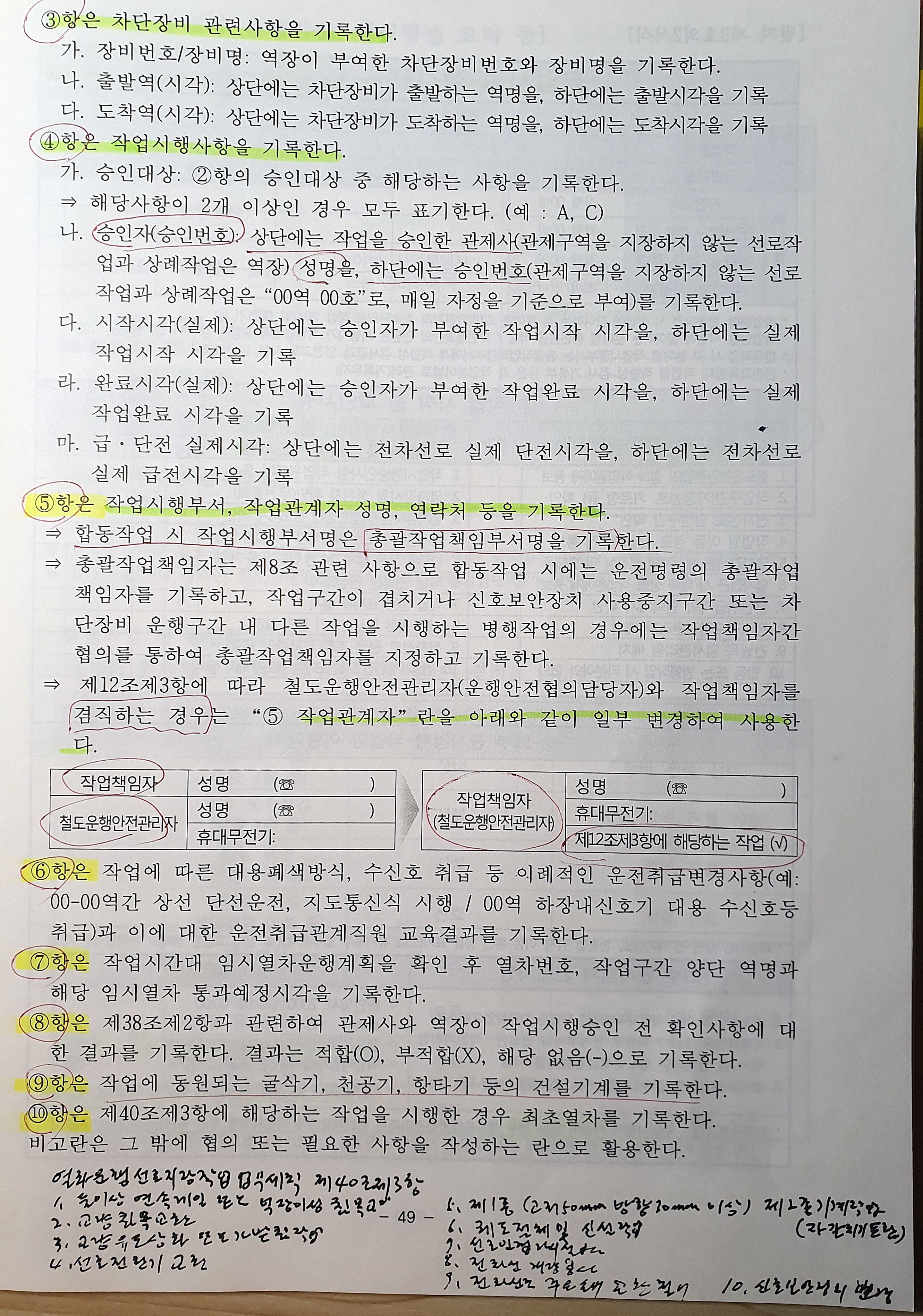 ⑤ 작업책임자는 제3항의 확인사항에 따른 운전취급 주의사항을 공사열차 운전자(기관사 또는 장비운전원)에게 알려야 한다. <개정 2018.09.28>