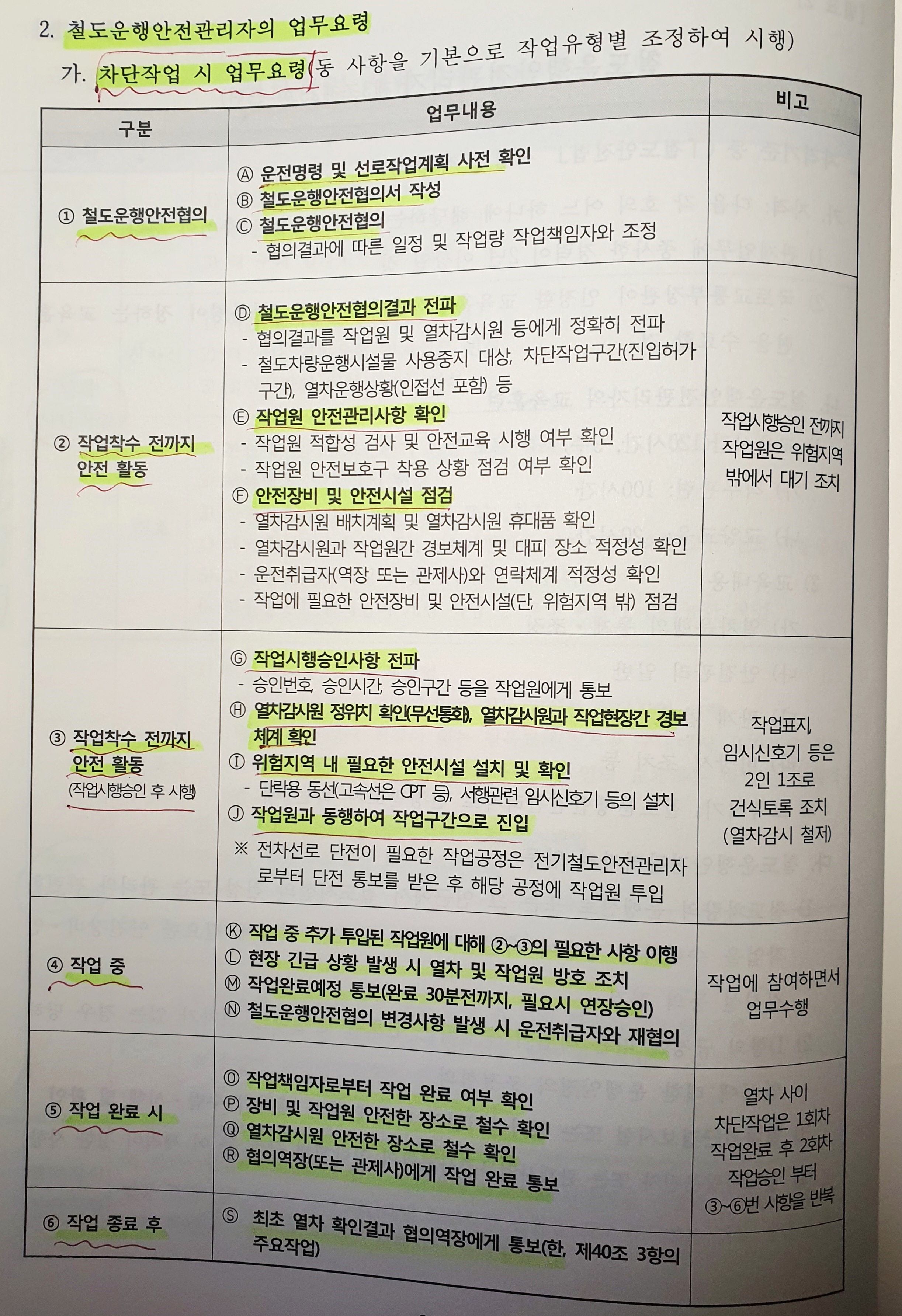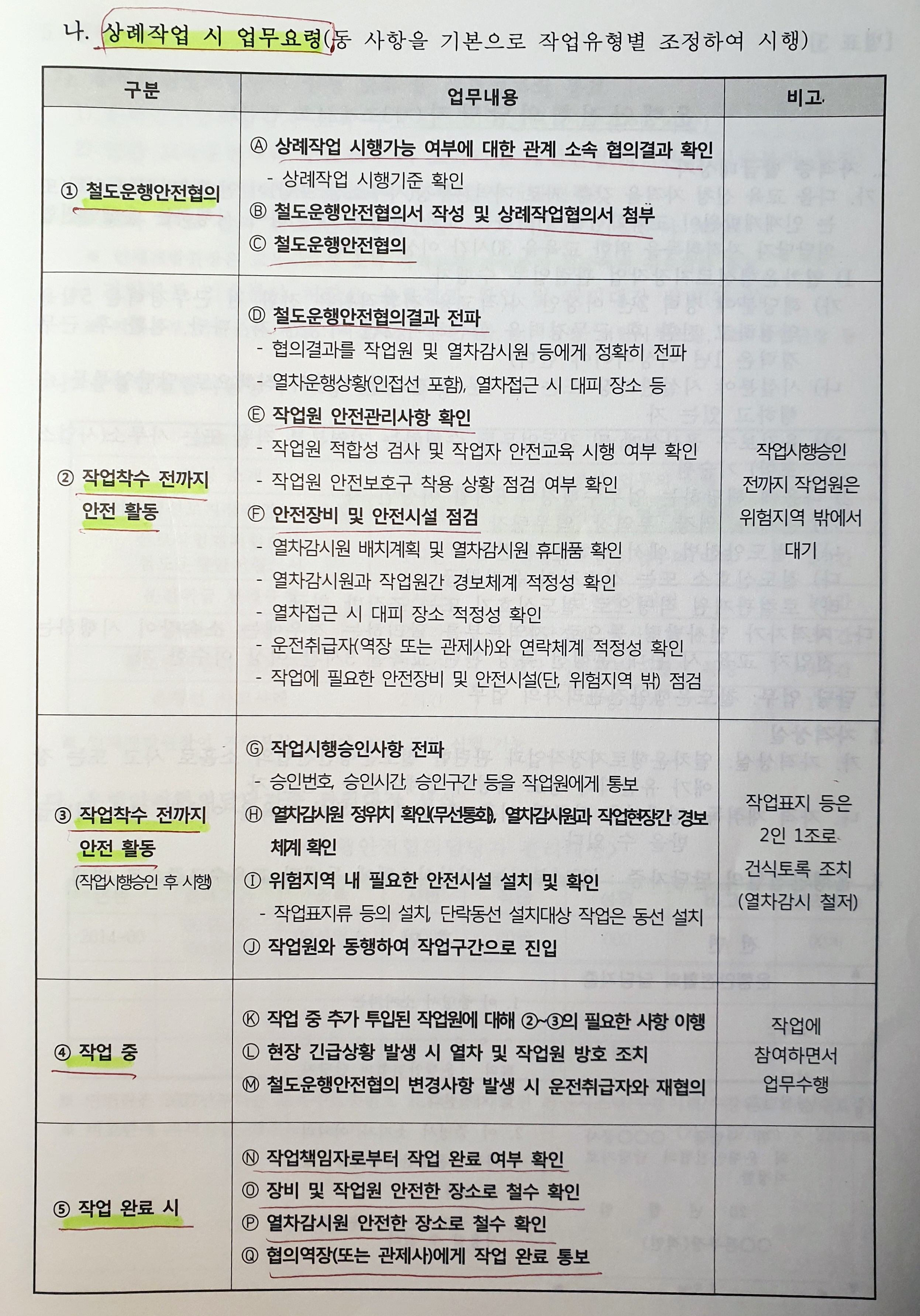 | 비고 1. 외부 공사업체는 제42조제1항에 따른 상례작업계획 협의를 사전에 시행할 것 2. 나목부터 라목은 위험지역 상부와 하부라 하더라도 위험지역 外 작업으로 분류한다. |