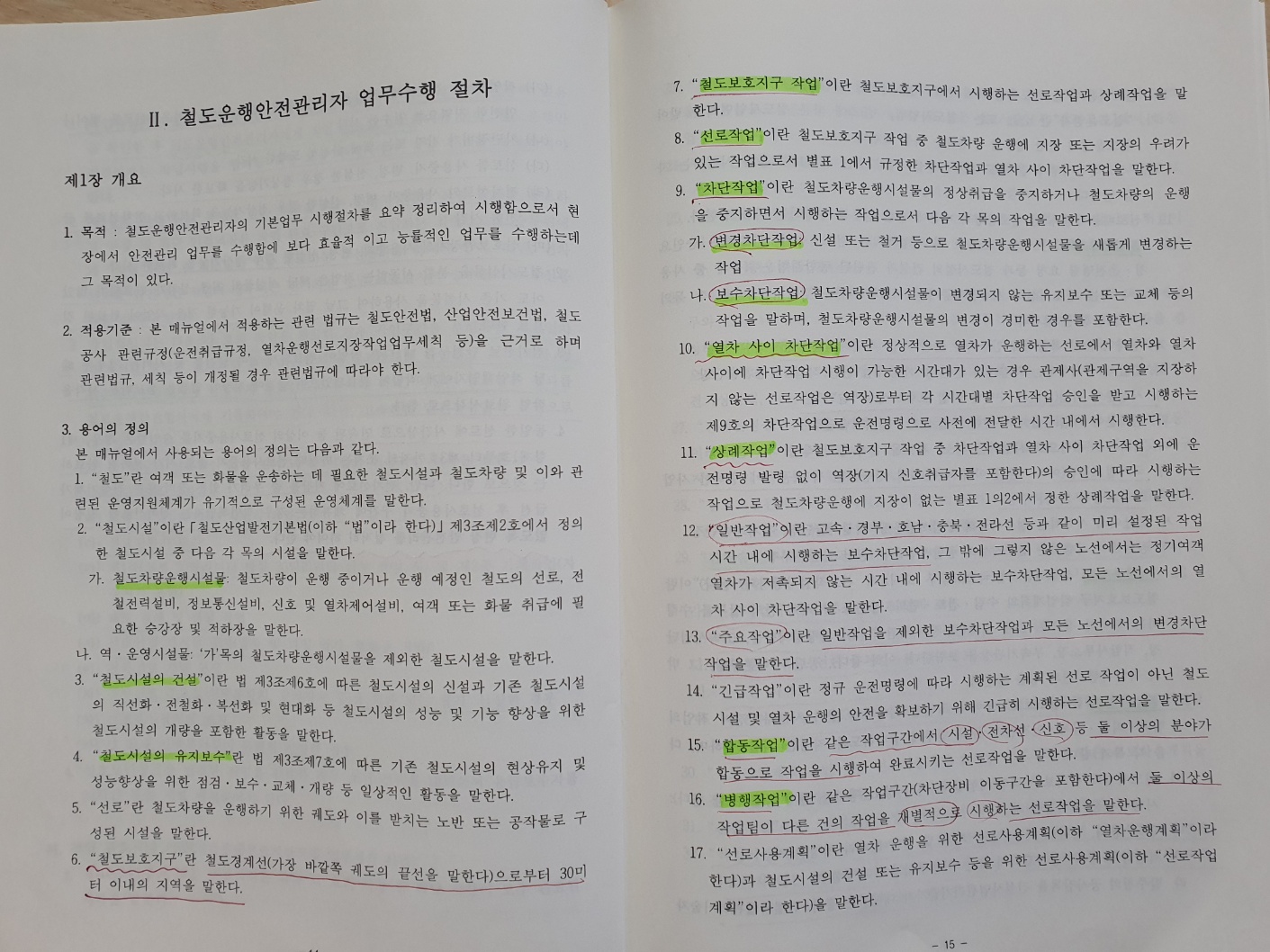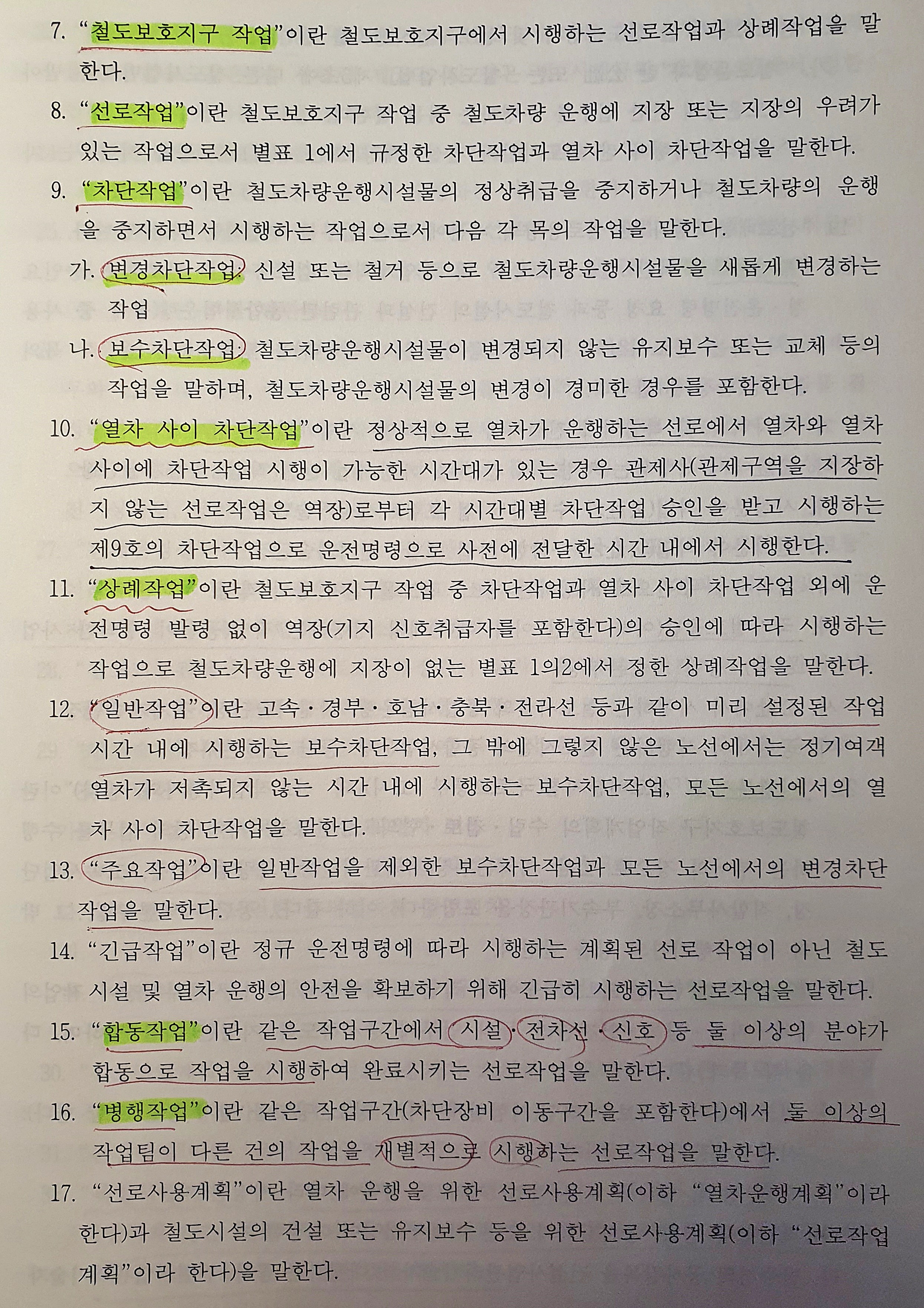 선로 | 1) 레일‧침목‧분기기 교체작업 - 열차안전운행에 지장이 있는 침목 교체는 차단작업 시행 - 열차안전운행에 지장이 없는 침목교체(정거장 구내에서 유지보수 직원들이 연속되지 않은 침목을 순차적으로 인력 교체하는 작업)는 상례작업 시행 가능 2) 역 구내 측선에 분기기 신설 또는 철거작업 3) 기타 변경차단작업 외의 차단작업 |