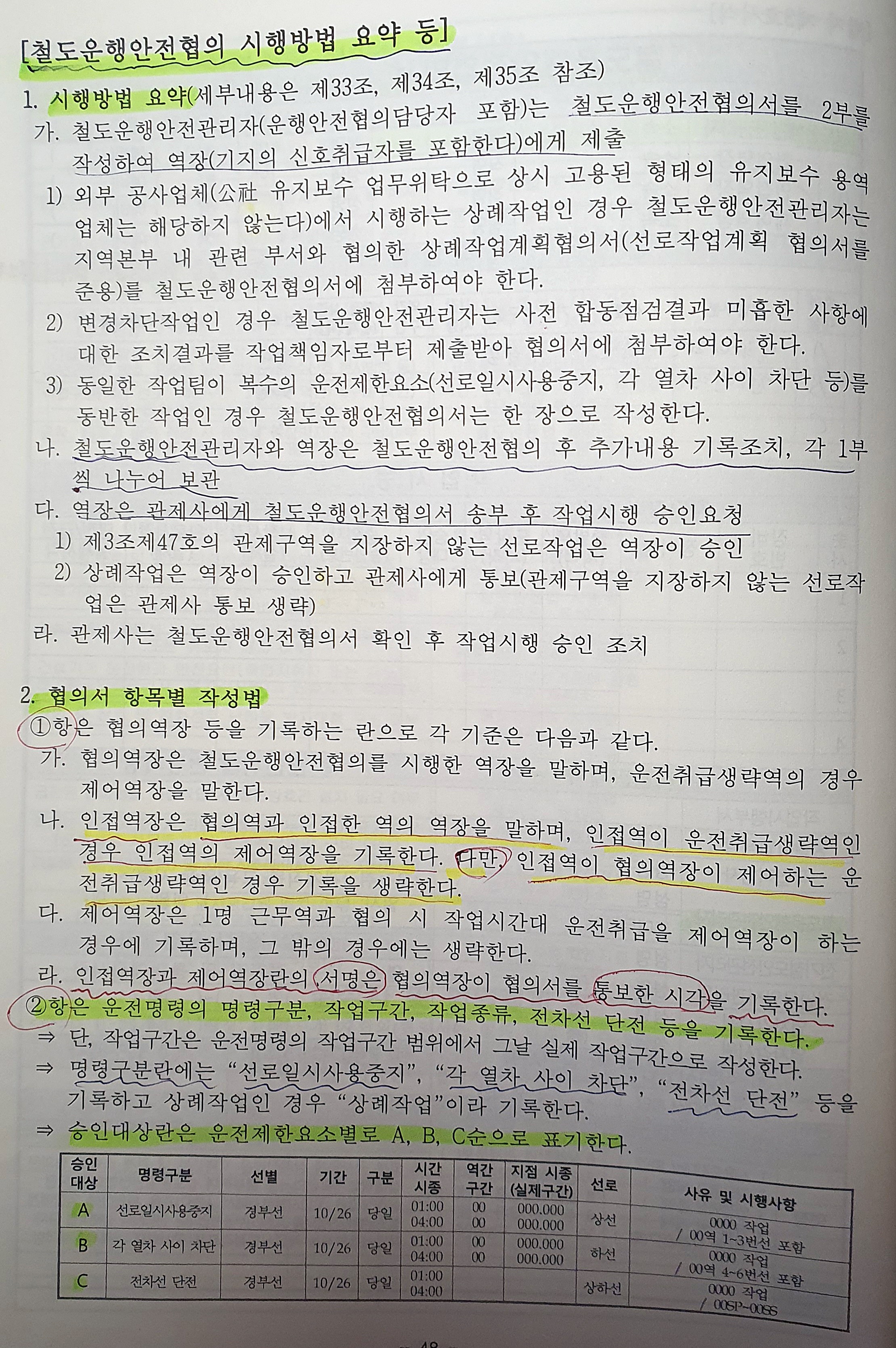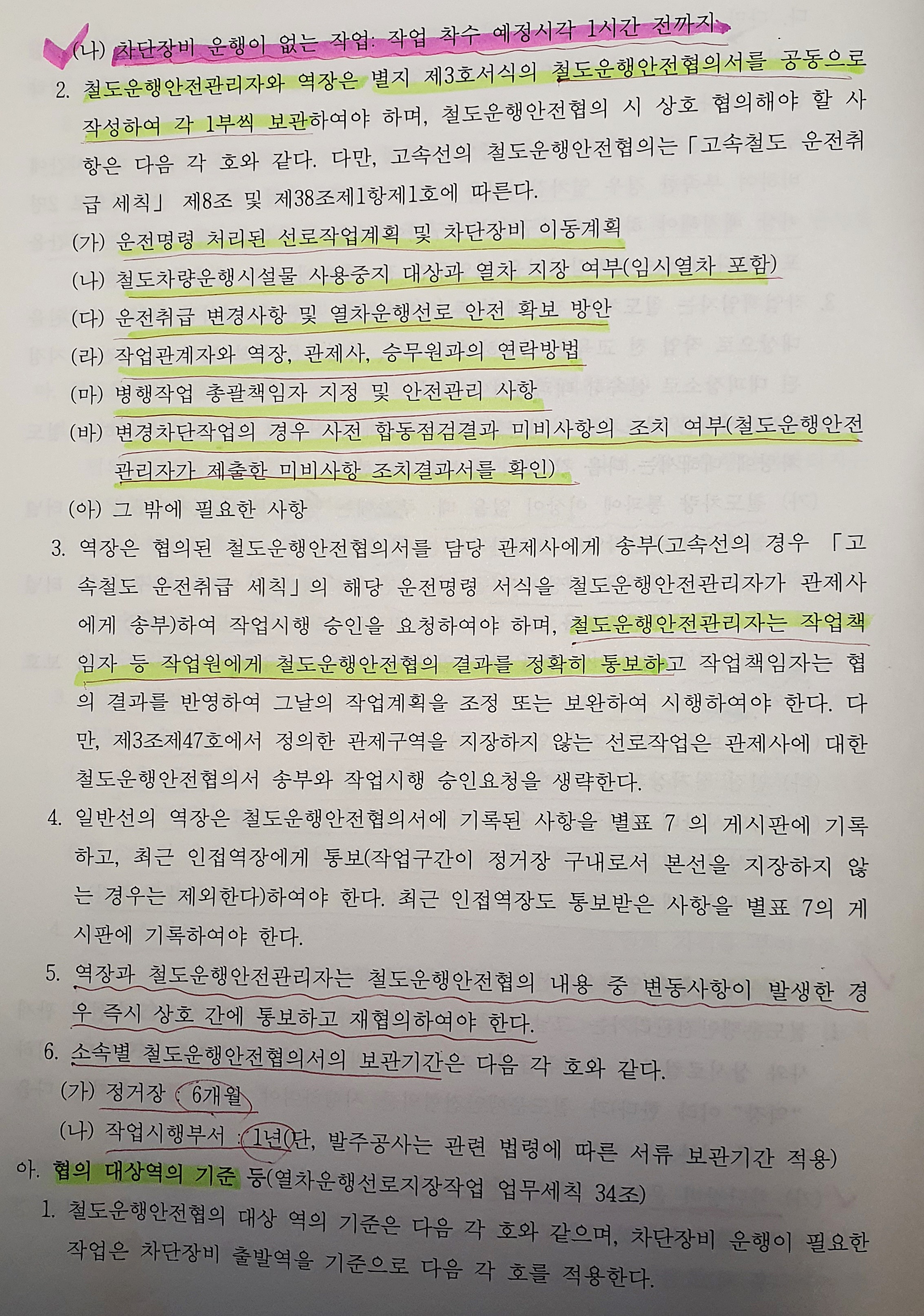 나. 가목의 협의가 완료된 작업의 시행일정과 운전취급사항: 역·사업소장