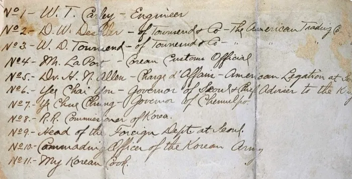 1번 기술자인 칼리(W.T. Carley), 2번 미국의 무역업체 타운센드의 직원 데쉴러(D.W. Desesler), 3번 타운센드의 대표 타운센드(W.D. Townsend), 4번 인천해관장(지금의 인천세관장)인 프랑스인 라포르트(M. Laport), 5번 주 조선 미국공사 알렌(H.N. Allen) 으로 나타났다.