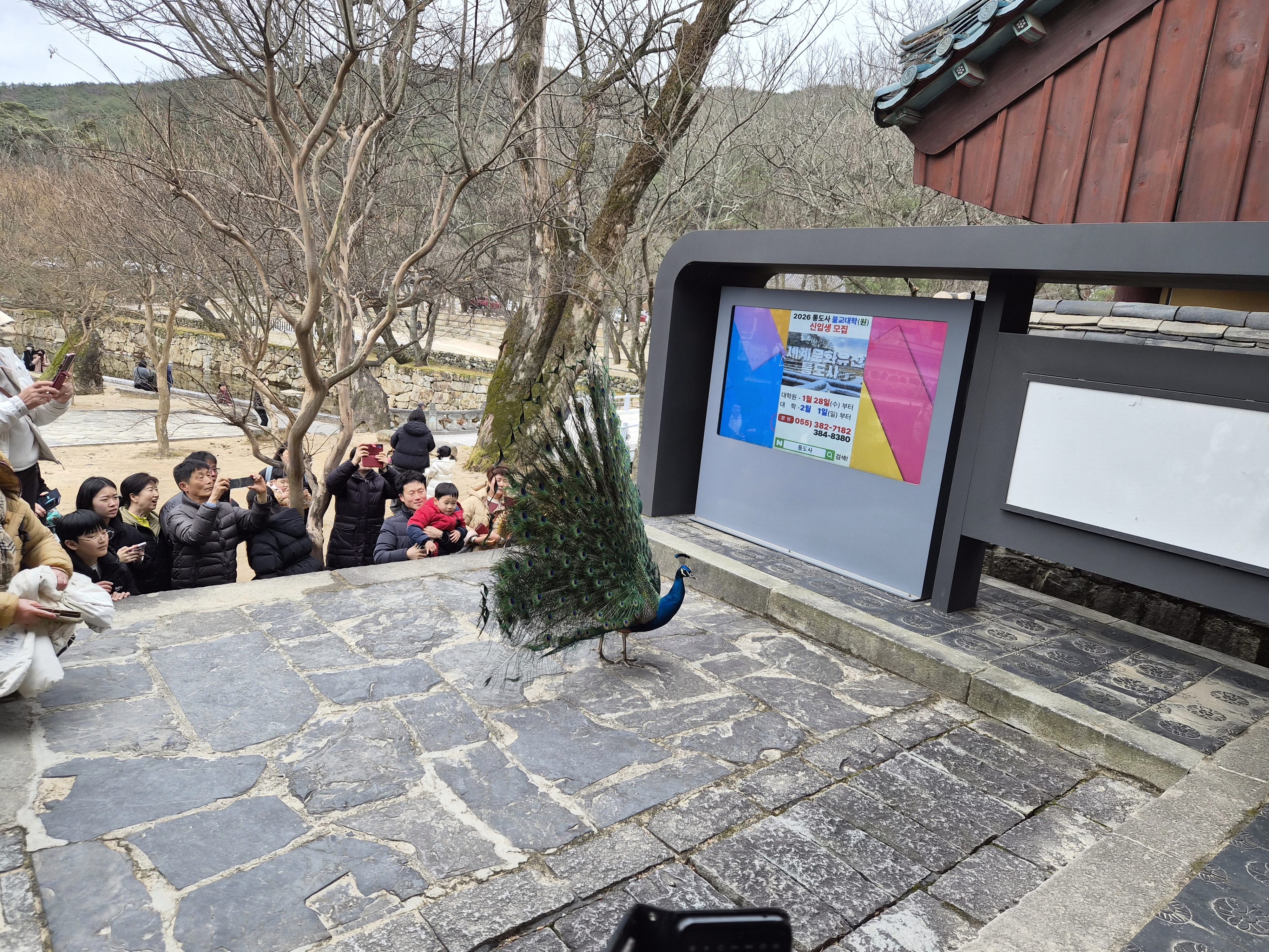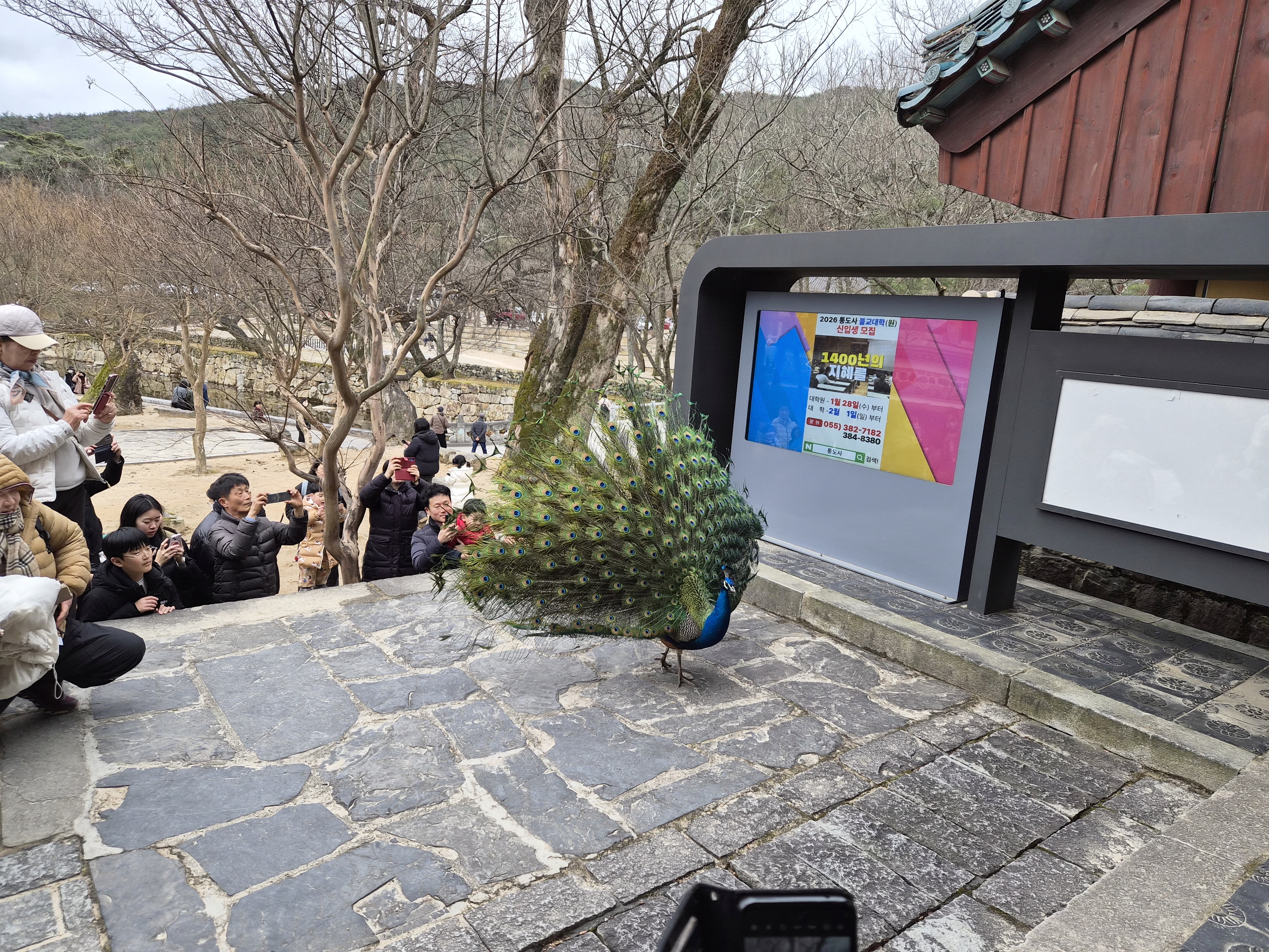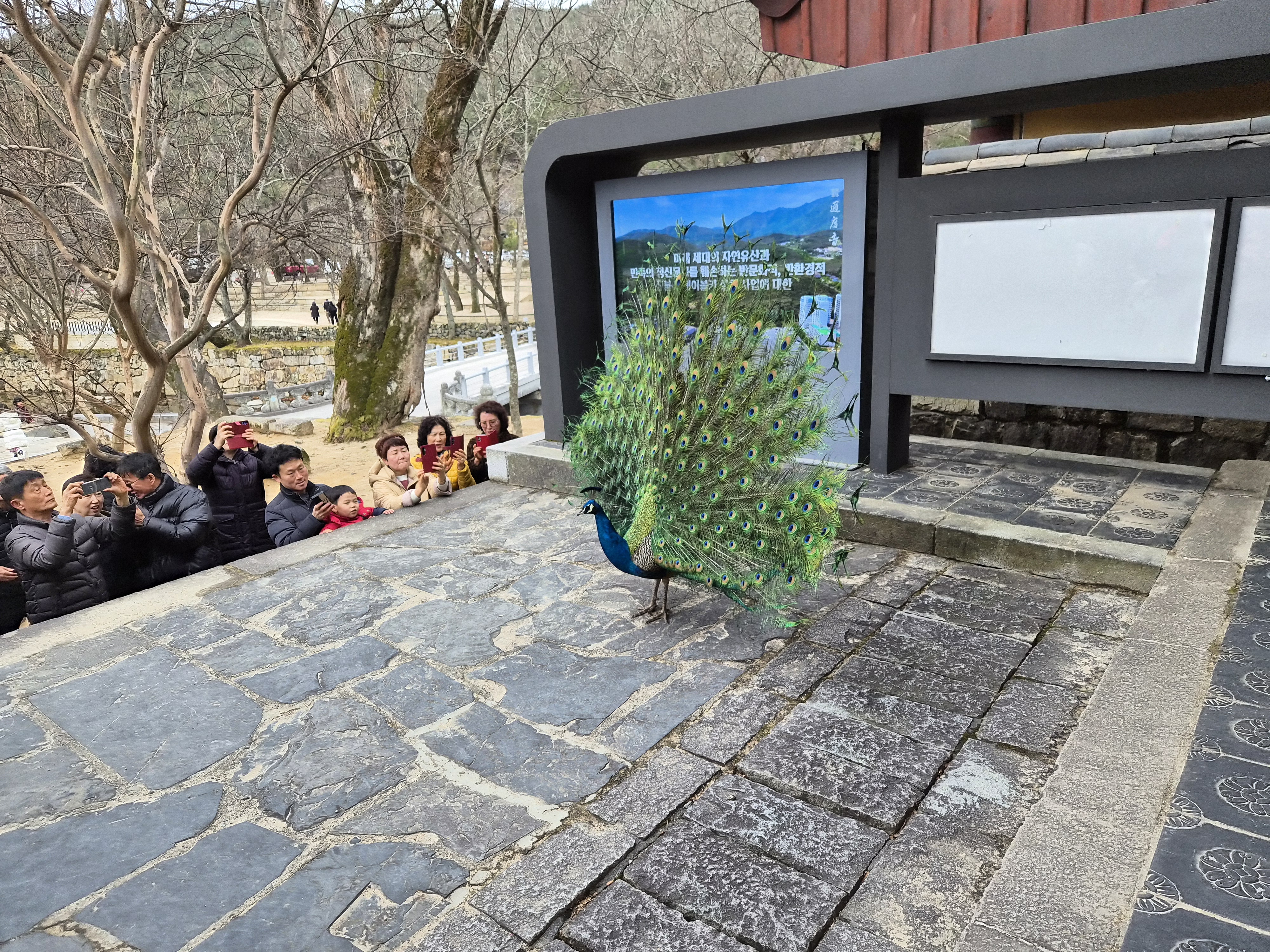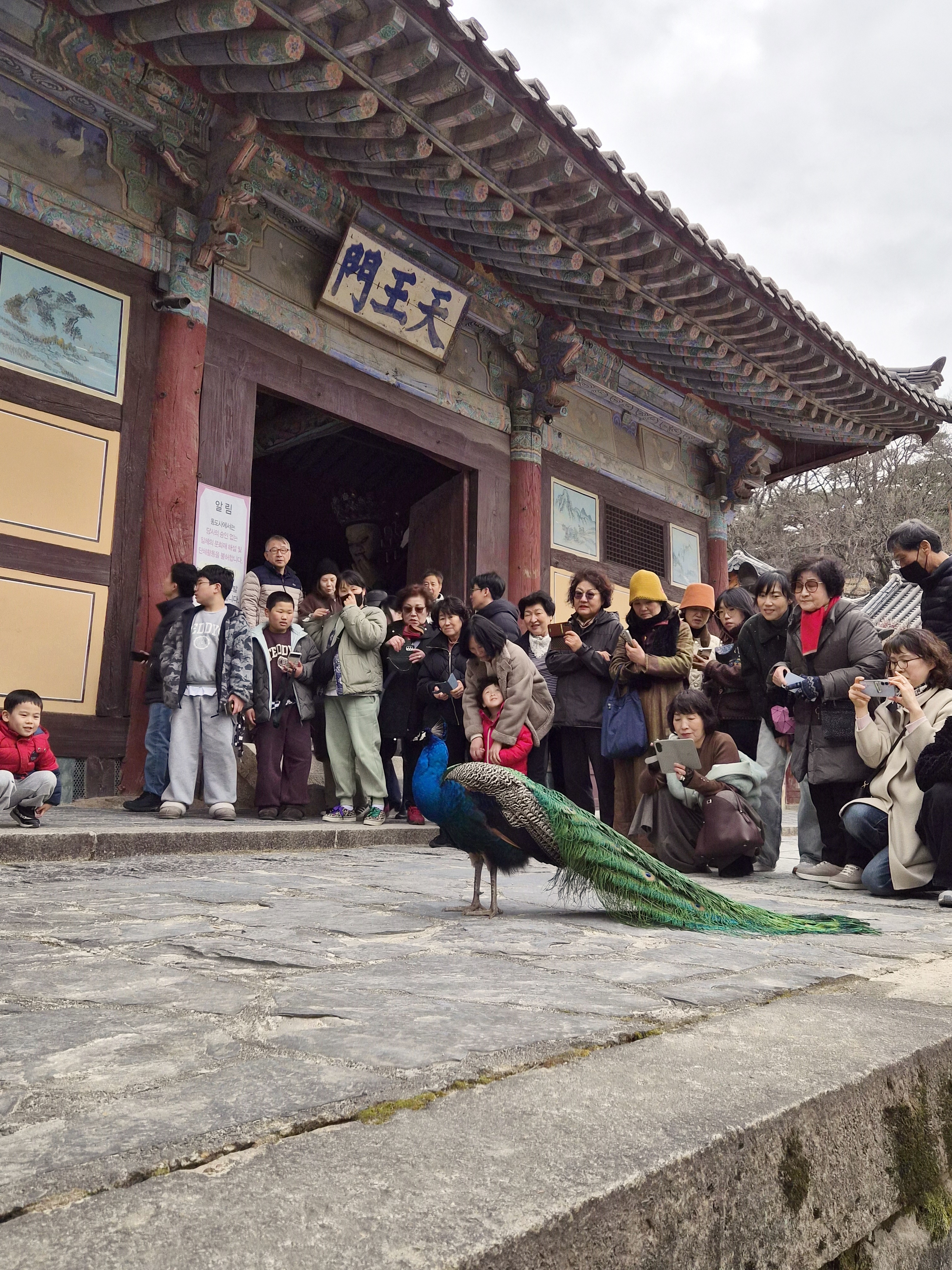 통도사 암자에서 키우는 공작새 1마리가 통도사 천왕문앞에서 날개를 혼자 펼치며 아름다운 자태를 뽐내고 있다.