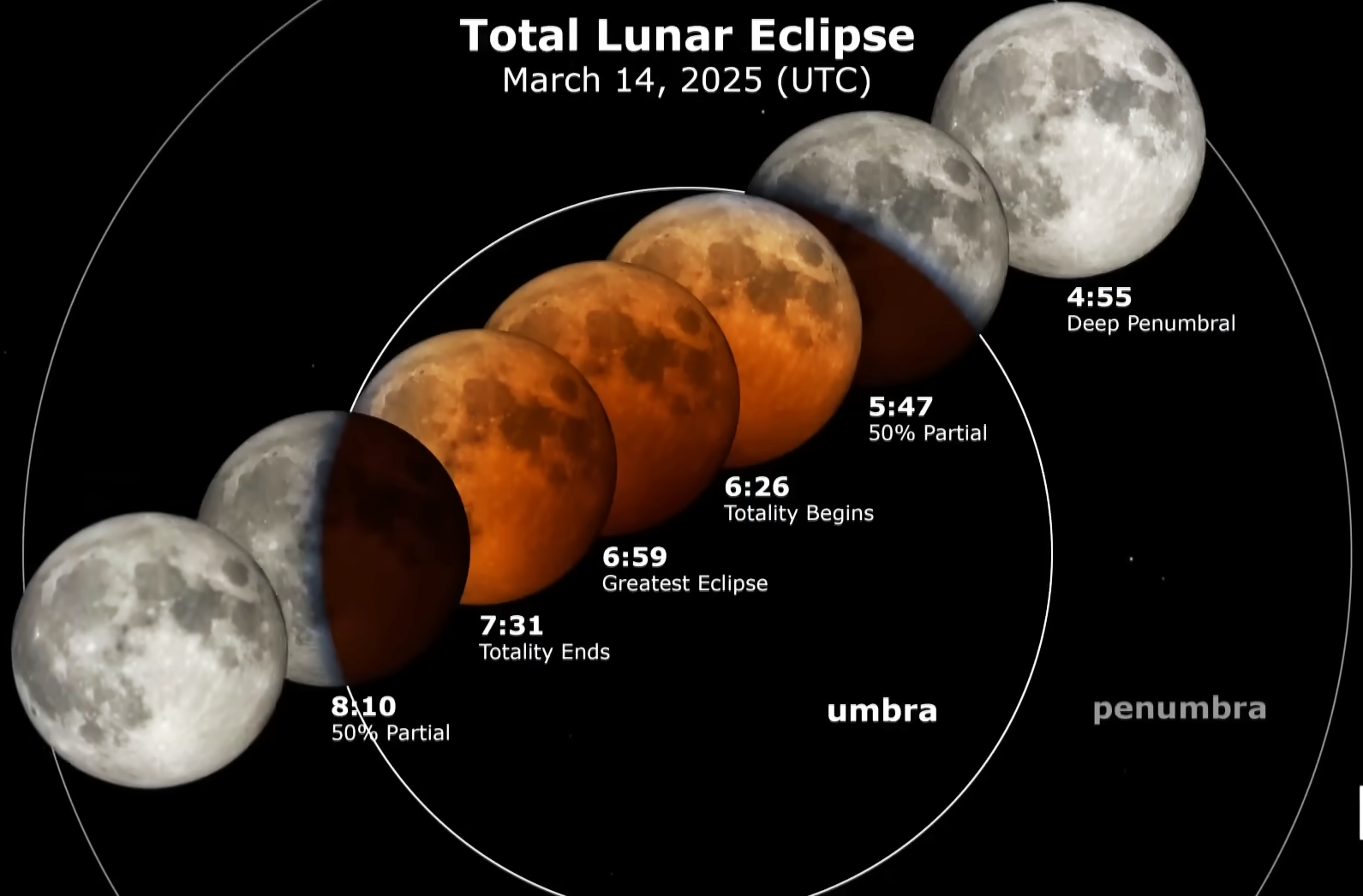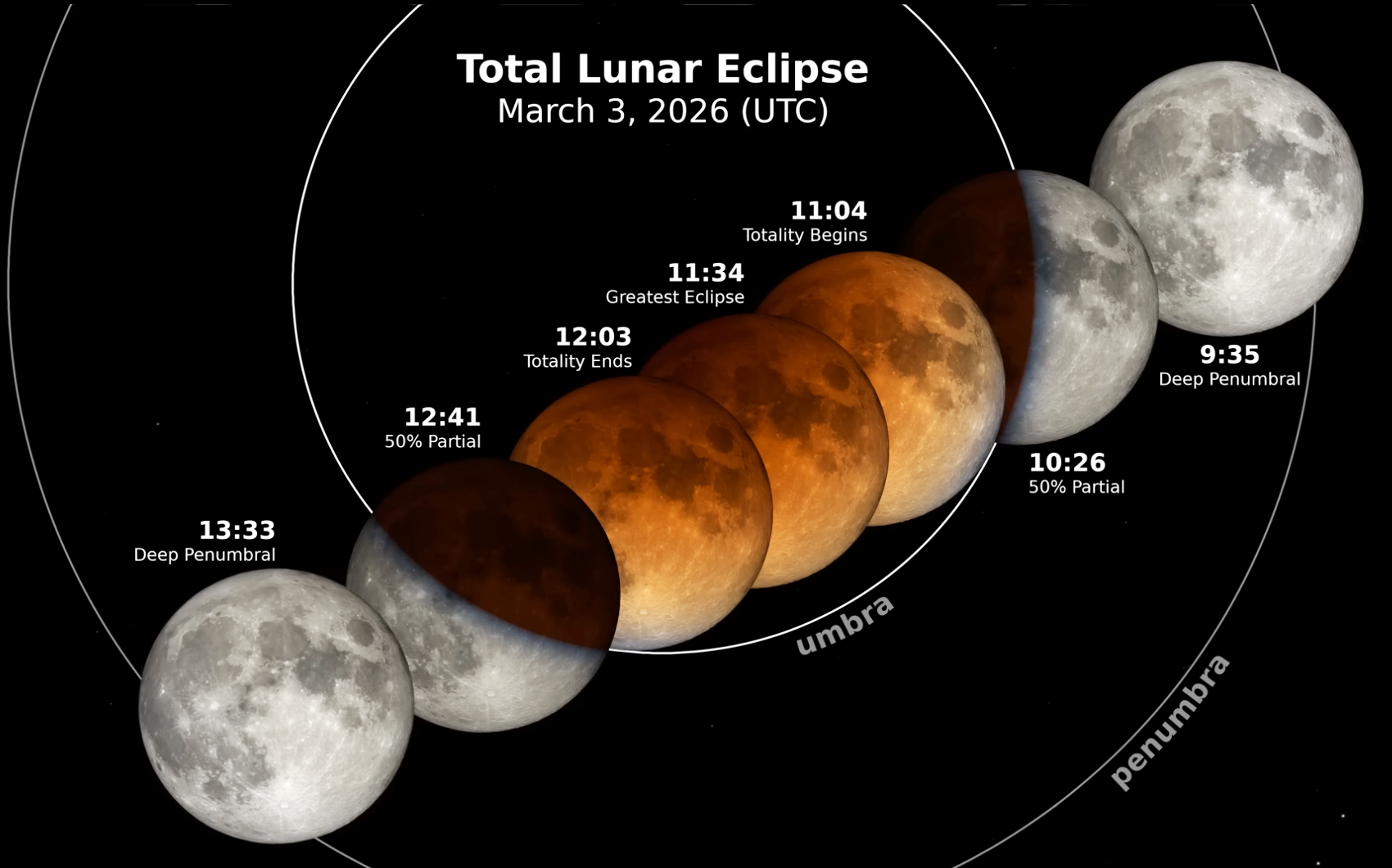 2026년 3월 3일 화요일, 여러 시간대에서 개기월식이 일어납니다. 이 데이터 시각화에서 달은 오른쪽에서 왼쪽으로 이동하여 지구의 그림자를 지나 일식의 다양한 단계에서 시간(UTC 기준)이 표시된 일식 다이어그램을 남깁니다.